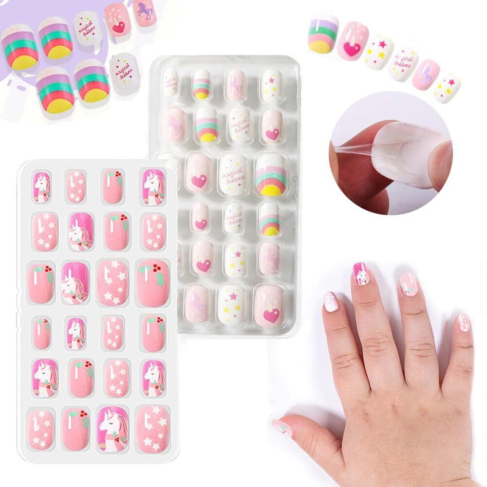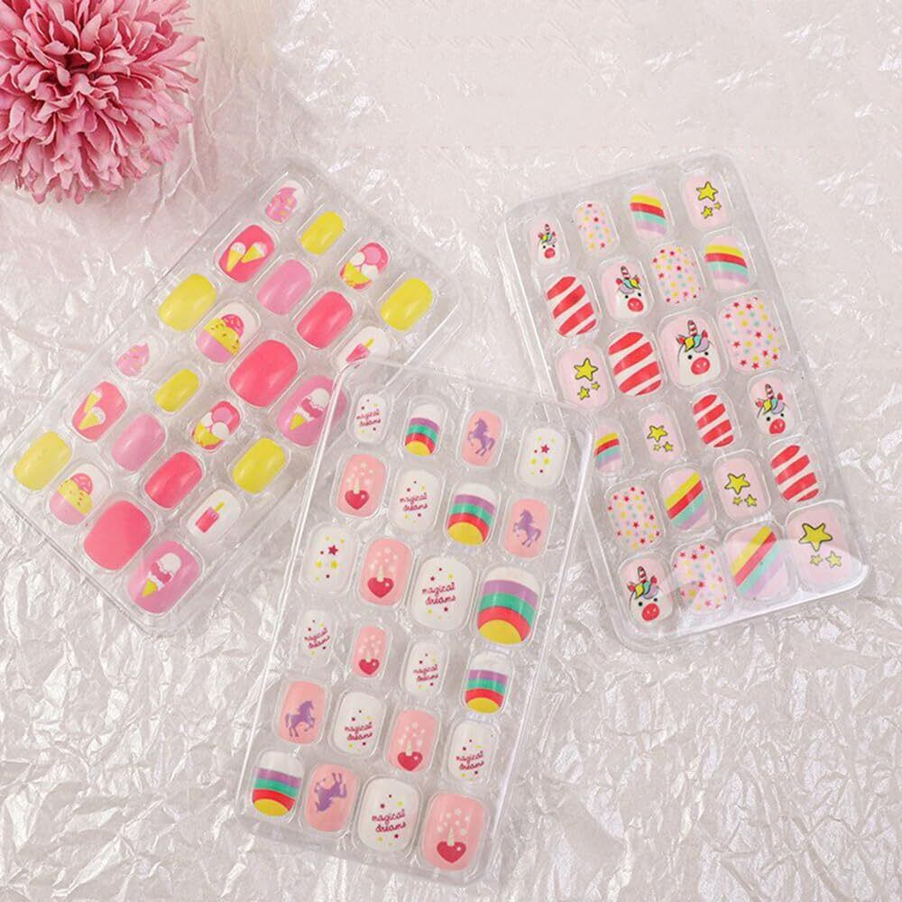 【カラフルなデザイン】可愛らしいモチーフがたくさん!鮮やかなカラーデザインが詰め込まれており、お子様が楽しくネイルを楽しむことができます。