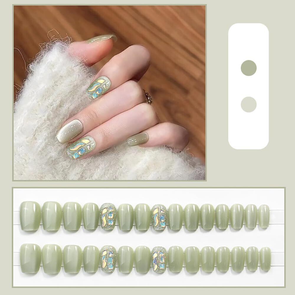 ネイルチップ 24枚セット くり返し使える ショート 大人かわいいミニマルデザイン オフィス/デート用 簡単リムーバブル 猫の目石ネイル シェル