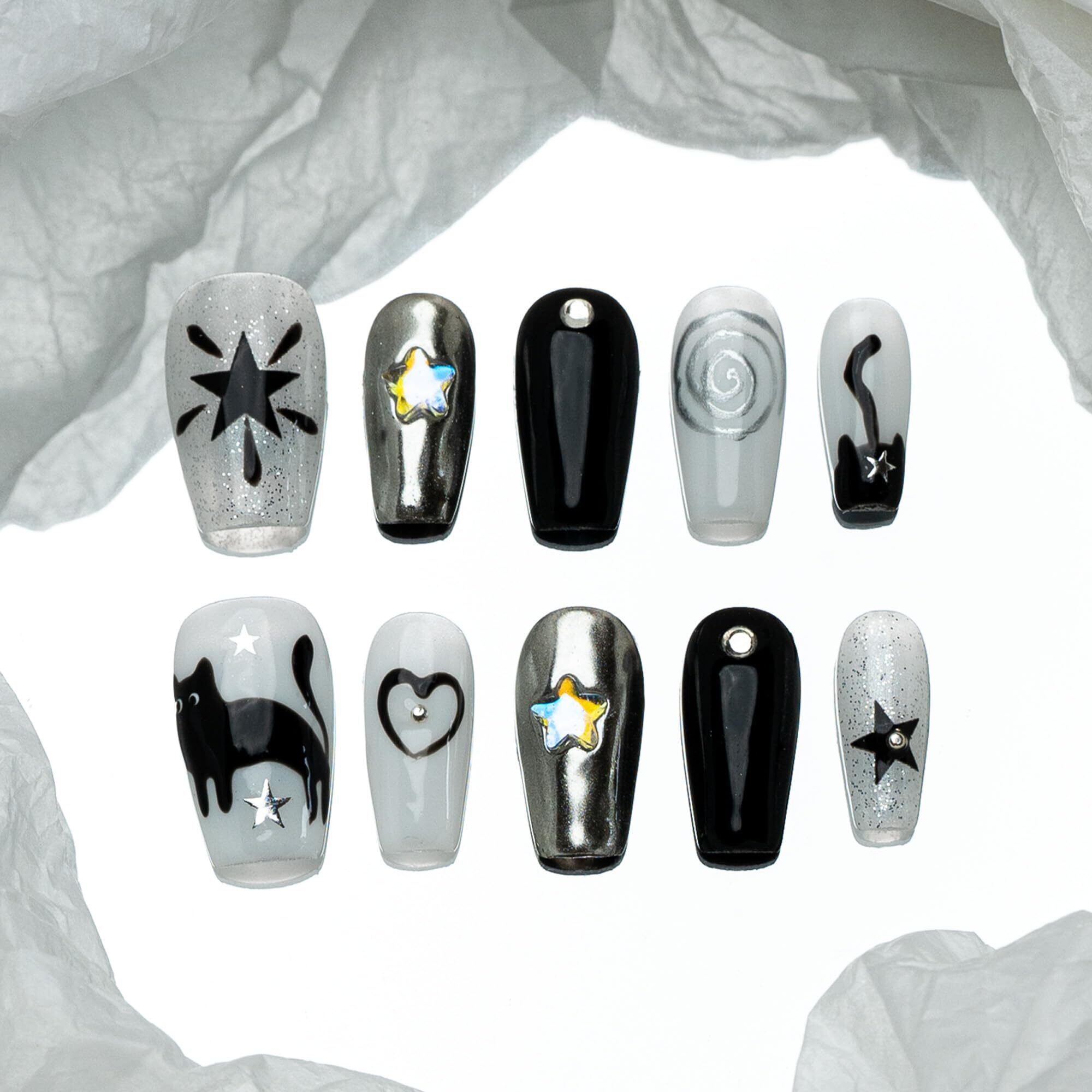【特価セール】Sun&Beam Nails 手作り ネイルチップ ミディアム ロング コフィン バレリーナ ブラック ホワイト つけ爪 手描き ストーン こねこ デザイン おしゃれ 付け爪 10枚入 (#207 M)