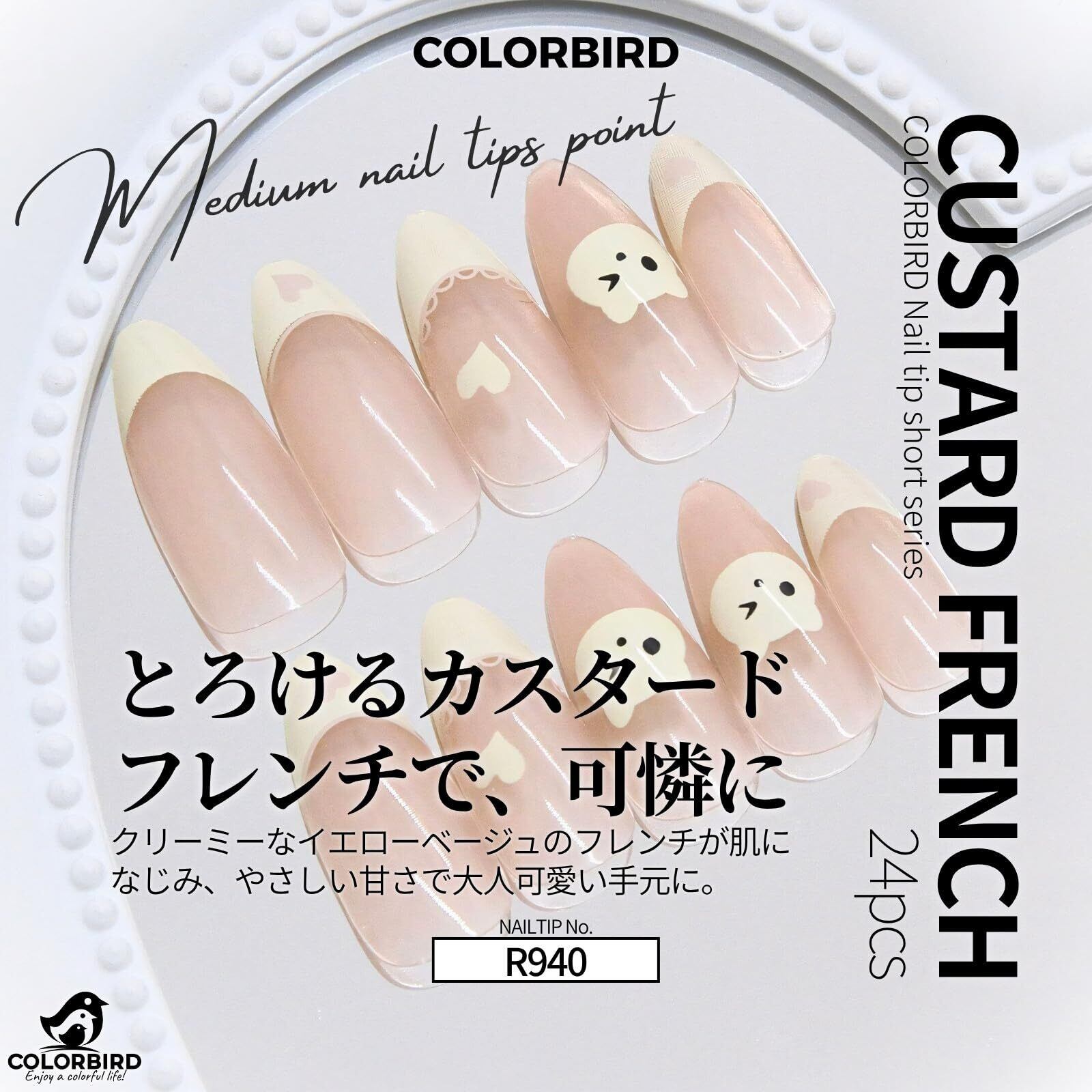 【在庫セール】COLORBIRD ネイルチップ フレンチ 猫 ミディアム 24枚 ネイル 付け爪 チップ 短め 可愛い ポイント (R940)