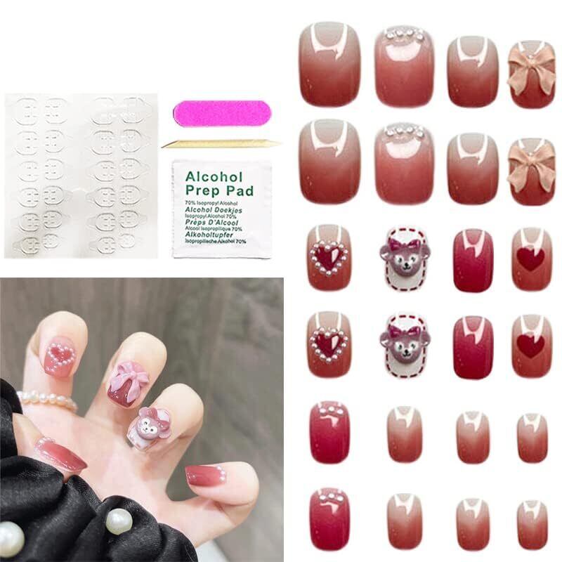 【新着商品】【ネイルアートの道具セットを贈る】AAGWW ネイルチップ ベリーショート 付け爪 短い 成人式 マット つけづめ つけ爪 付け爪 ネイルちっぷ かわいい 美甲 用品 工房 糊デザイン(色:かわいいリボン 内容:24枚ネイルアート +糊)