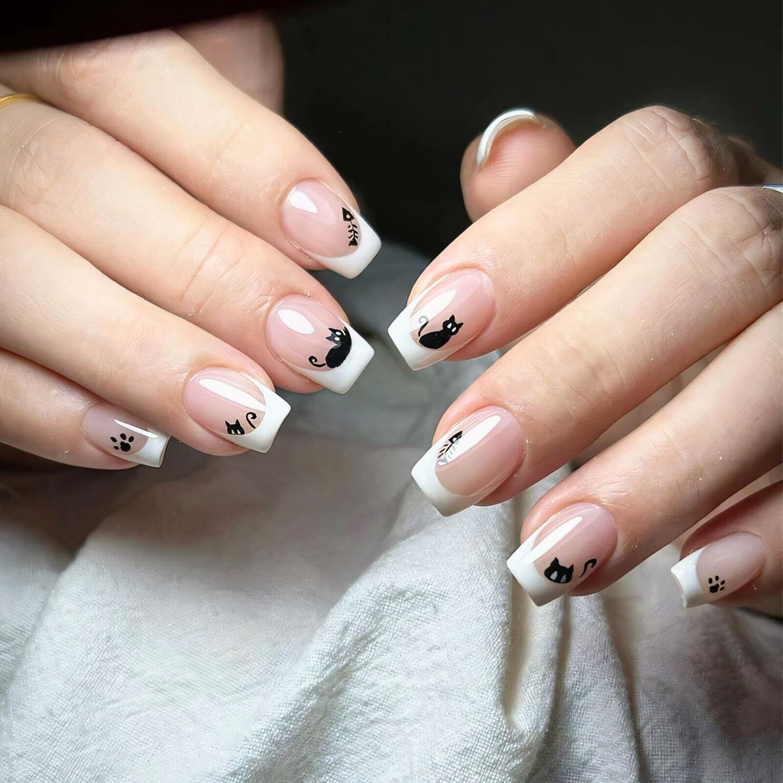 【人気商品】COLORBIRD ネイルチップ ショート 24枚 フレンチ 猫 白 ネイル 付け爪 チップ 短め 可愛い スクエアオフ (R859)