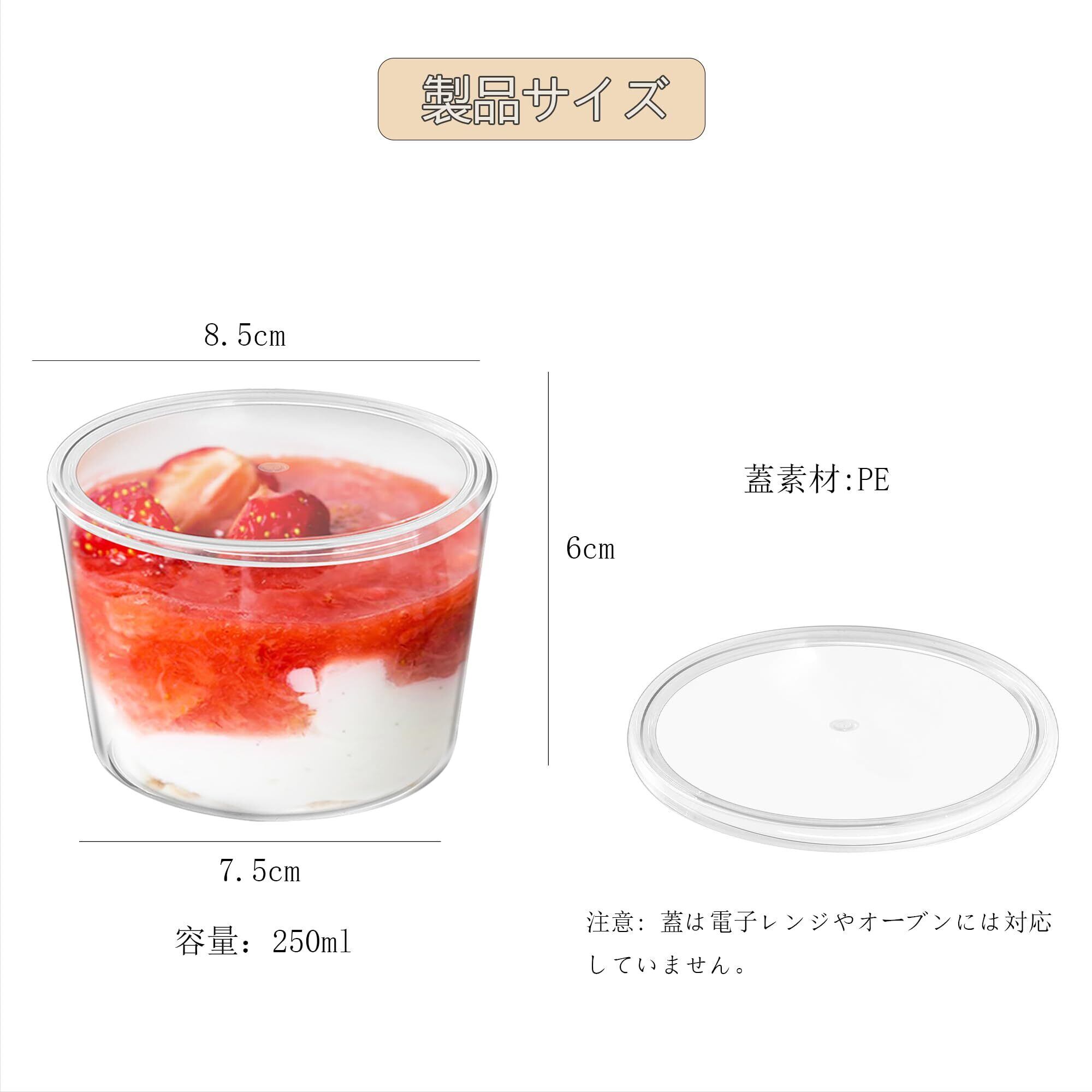 【高品質】このプリン 型は耐熱性ホウケイ酸ガラス製で、-20℃から150℃までの温度に耐え、電子レンジやオーブンにも安心して使用でき、再利用も可能です;蓋はポリエチレン製,密閉性が良い(注:蓋はオーブンや電子レンジには入れられません)。