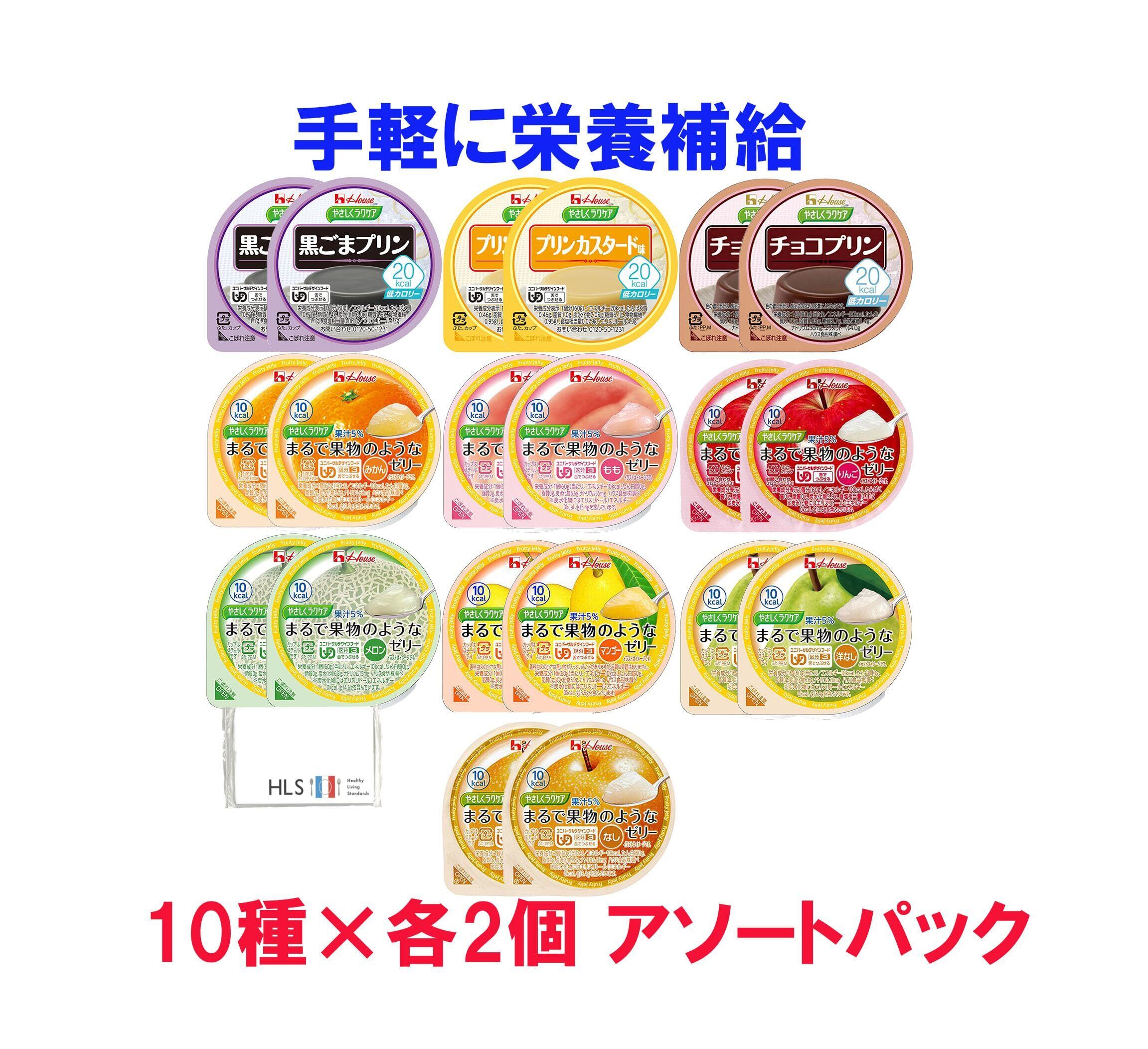 【HLS】 やさしくラクケア 10種×各2個 (計20個) (まるで果物のようなゼリー 7種 + 低カロリープリン 3種) アソートセット 舌でつぶせる ダンボール詰め HLSオリジナルポケットティッシュ付