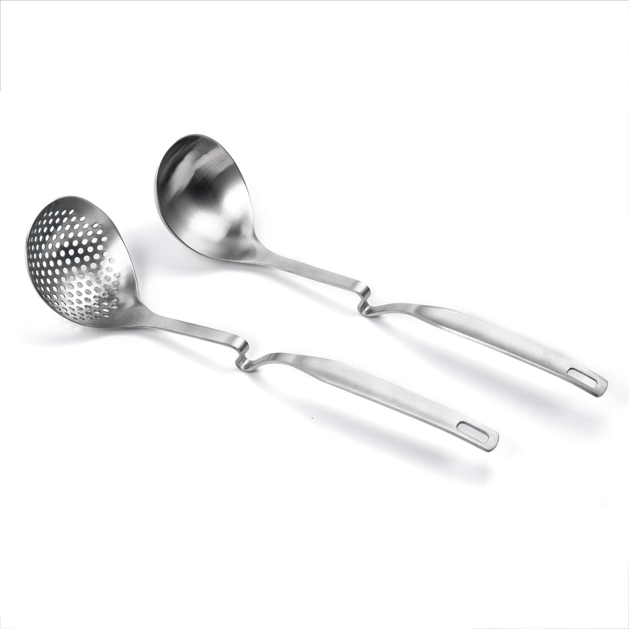 1.鍋物の必需品で汁物にお玉、具だけの時は穴あきお玉と使い分けです。お鍋や容器のフチにかけられるフック付き、持ちやすく、質感があり、見た目は綺麗ですが、実用性も高いのお玉セットです。