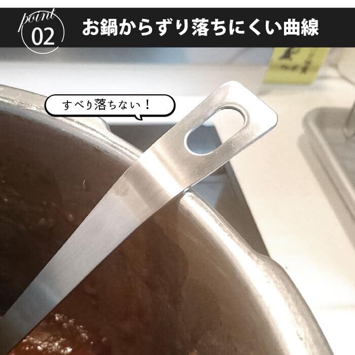 鍋に立てかけていたお玉が、うっかり鍋の中にお玉が入っちゃったって経験ありませんか?当商品は、柄を使いやすいように曲げてあるので、鍋からずり落ちにくくなっています。
