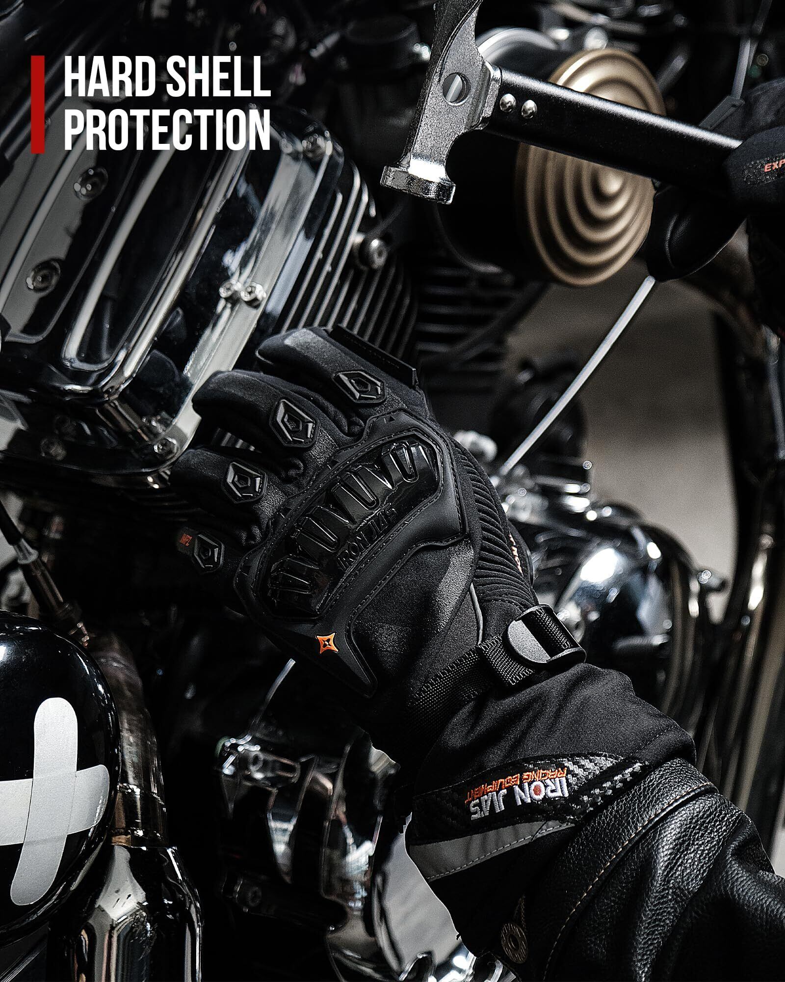 【プロテクション付き・全面的な保護】本製品はCE1レベル認証を取得しました。証明書番号:0598/PPE/25/5760;型番:WP02(AXE01) IRON JIA'Sバイク用グローブは、手の甲、指の関節、パーム等でたくましいナックルガードが付きます。ハードシェルのプロテクションが耐衝撃性が抜群で、ライディング中の安定性が提供されています