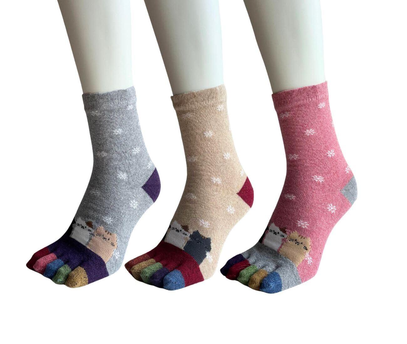 [モードセレクト] 5本指ソックス レディース 暖かい 冬 厚手 毛混 アンゴラ混 5本指靴下 レディース かわいい 猫柄 3足セット(色お任せ) A46
