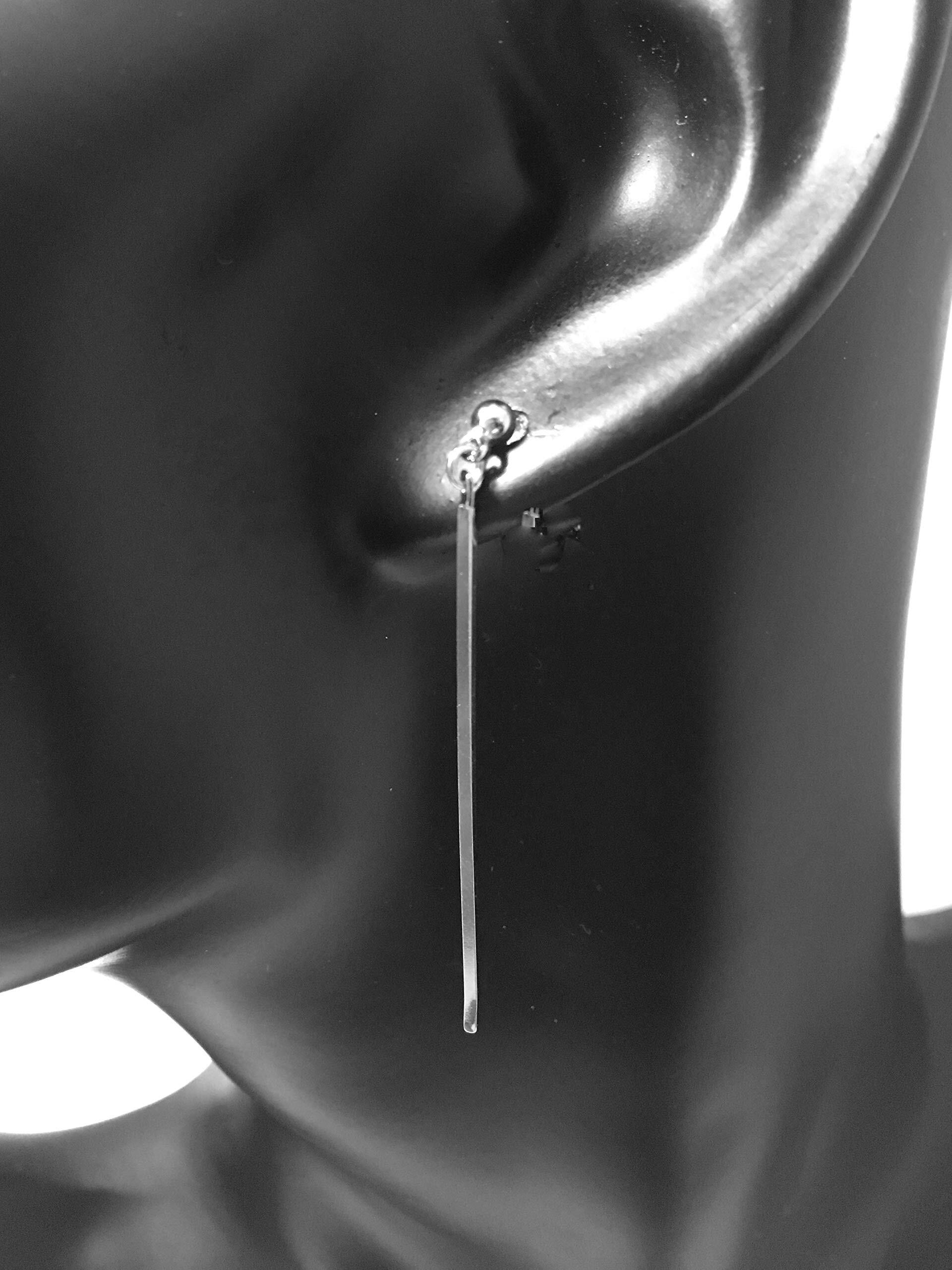 【ピアス部分】 長さ:約1.3cm 銀球の幅:0.2cm ポストの太さ:約18ゲージ 【ピアス部分の金属の素材】チタン+ニッケルフリーメッキ(ポスト部分はメッキ無し)※ピアス部分の素材がチタンにグレードアップしました。※キャッチはステンレスです。【ピアスのカラー】シルバー 【デザインパーツ部分】 幅:約0.1cm 長さ:約4.5cm 【デザインパーツの金属の素材】合金製 【仕様】耳にポストを通してキャッチで留めるタイプのスタッドピアスです。
