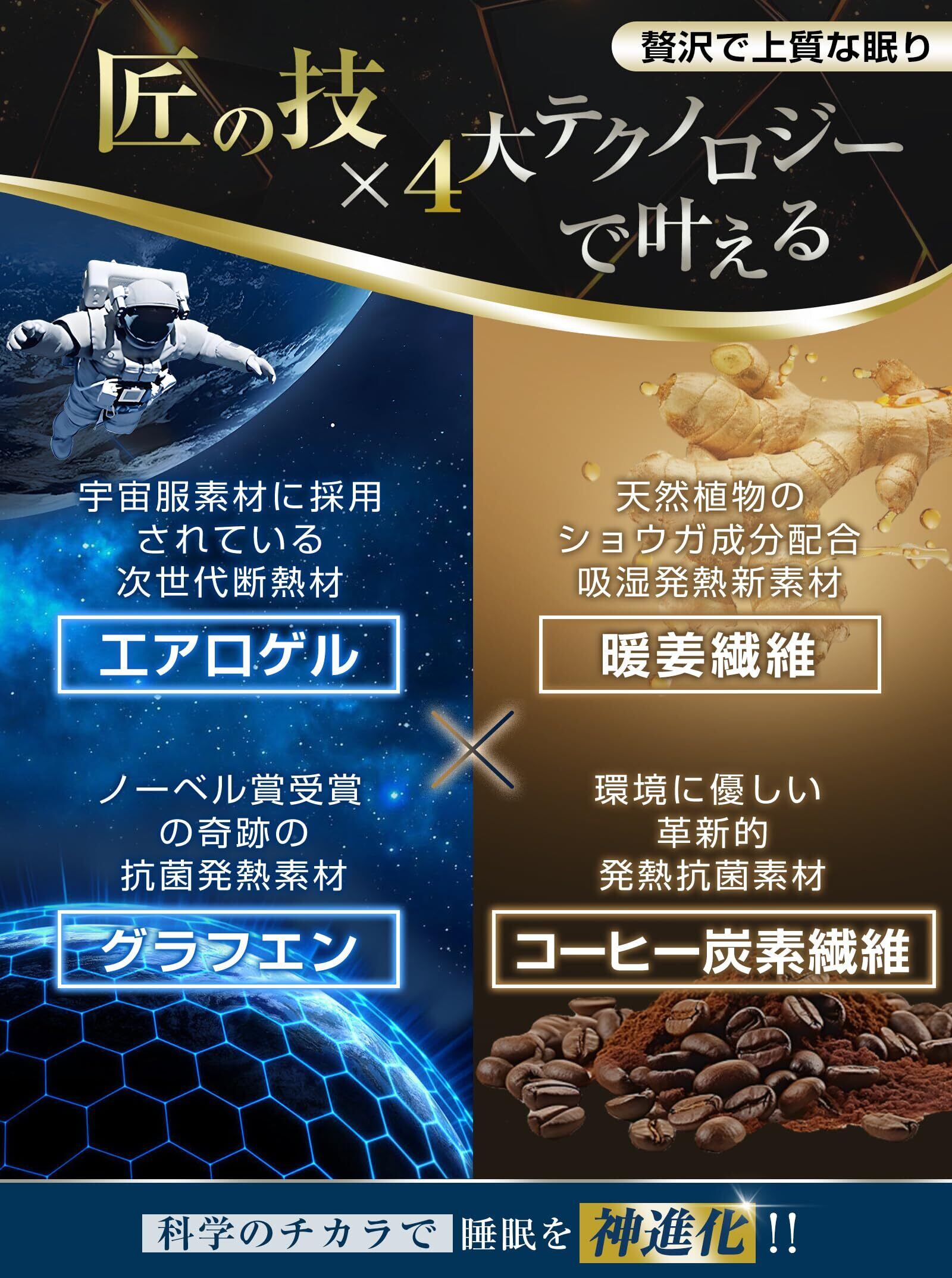 【匠の技×4大最先端テクノロジー素材で叶える、贅沢で上質な眠り】宇宙服素材に採用されている次世代断熱材「エアロゲル」×ノーベル賞受賞の奇跡の抗菌発熱素材「グラフェン」×温活おすすめの天然ショウガ成分配合の吸湿発熱新素材「暖姜繊維」×環境に優しい革新的発熱抗菌素材「コーヒー炭素繊維」。この4つの最先端テクノロジーで、次世代のあったか敷きパッドが登場!科学のチカラで睡眠を神進化!!この一枚で、真冬の睡眠が驚くほど快適に。セットで暖房いらずで朝まであったかポカポカ。