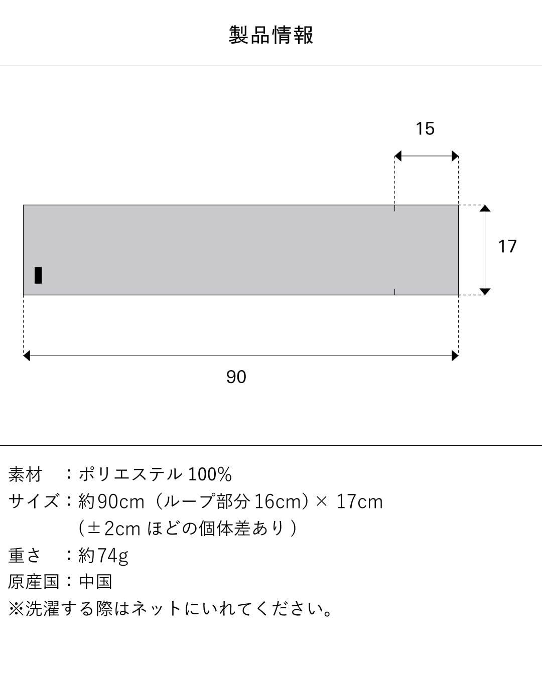 素材:ポリエステル100% / サイズ:約90cm(ループ部分16cm)×17cm(±2cmほどの個体差あり) / 重さ:約74g / 原産国:中国 / ※洗濯する際はネットにいれてください。