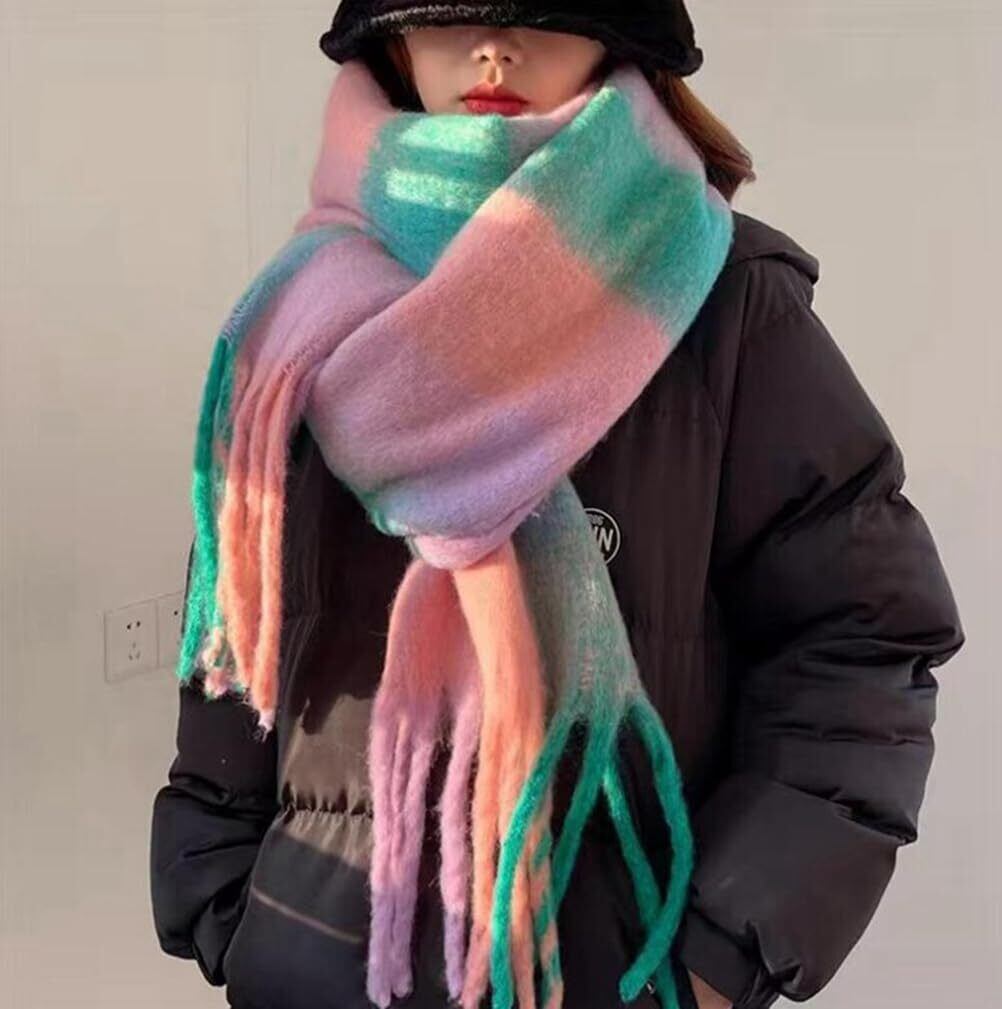 [YAYUPLUS] マフラー レディース ストール チェック柄 虹 ロングマフラー カシミヤ風 防寒 暖かい フリンジ 大判 ポレロ 秋冬 軽量 クリスマス