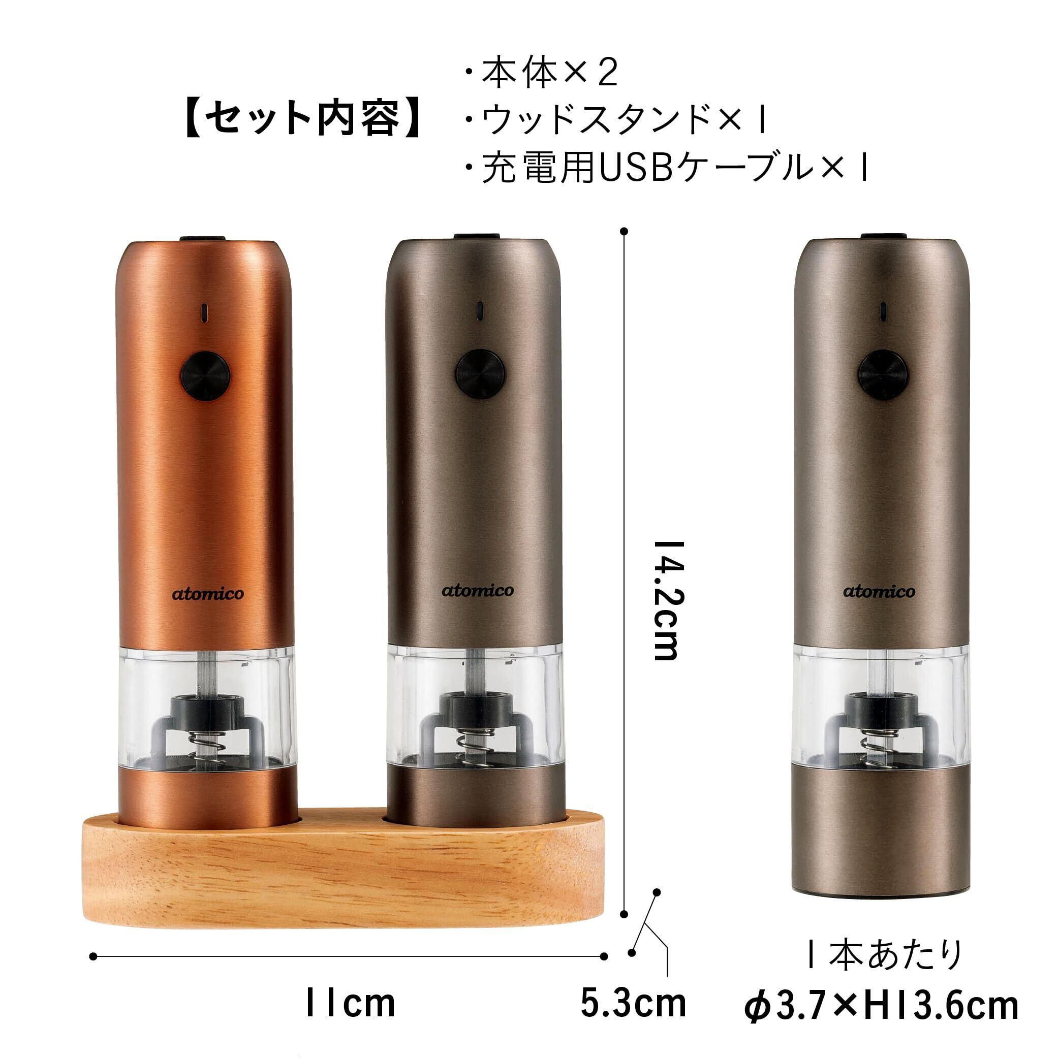 【新春セール】シービージャパン ペッパーミル 充電式 電動ミル ソルト&ペッパー カッパー&グラファイトグレー 2本セット 専用ウッドスタンド付 岩塩 胡椒 スパイス 粗さ調節可能 atomico