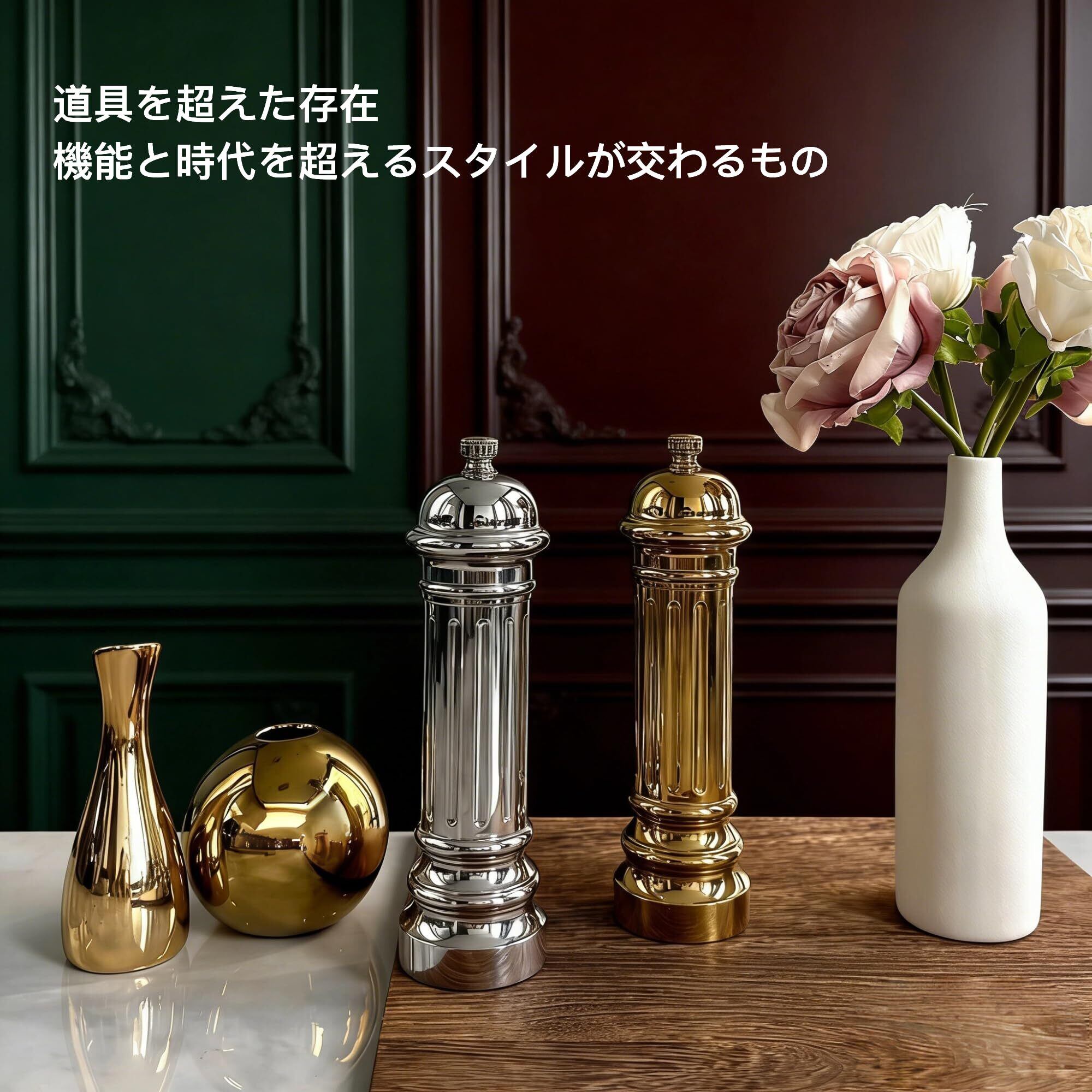 【人気商品】ペッパーミル 手動 ステンレス製ミル機構 高出力 こしょう ミル オールメタル構造 粗さ調整可能 再充填式 鏡面仕上げ(ゴールド)