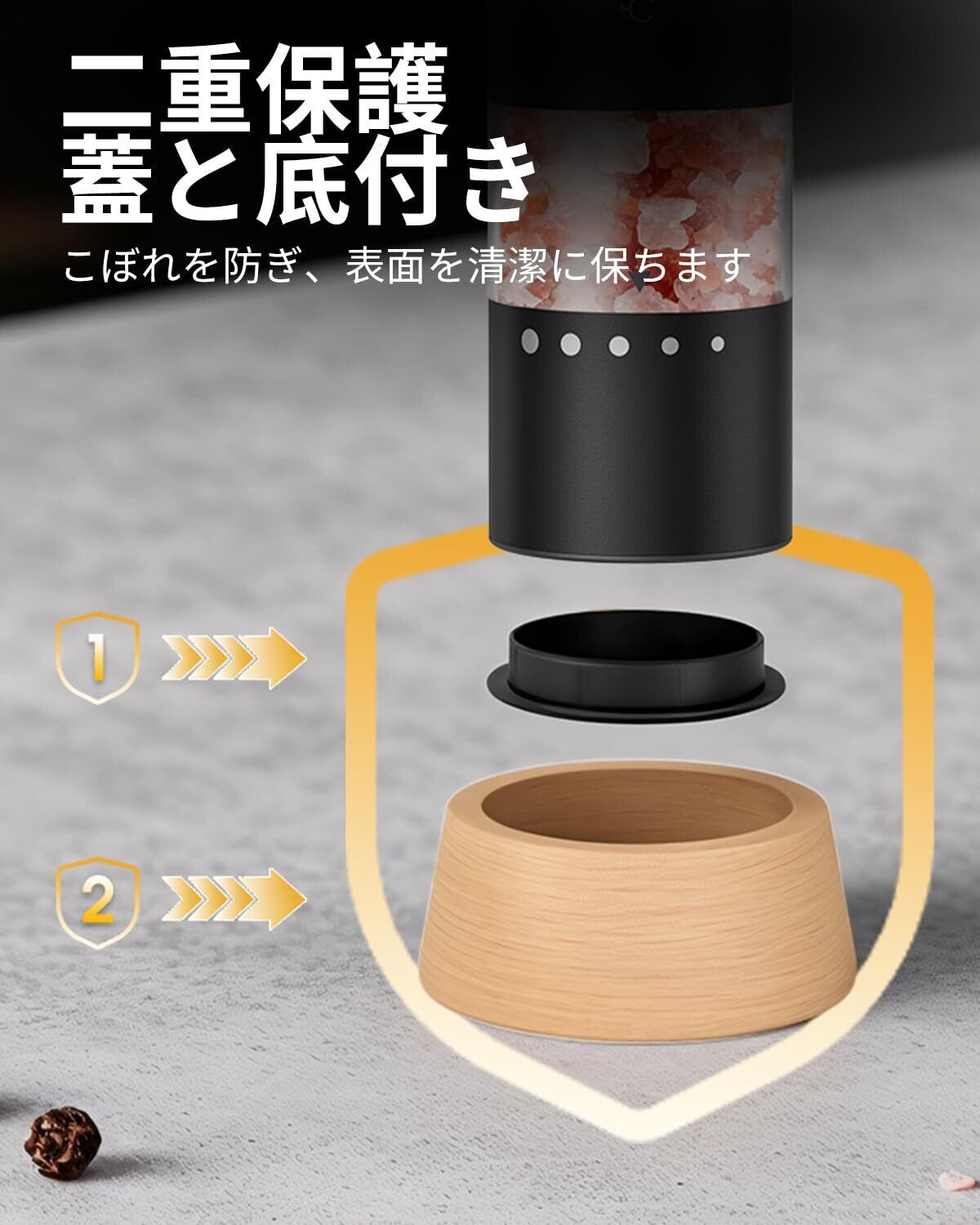 ️片手で操作 - ボタンを押すだけで、この電動ペッパーグラインダーセットは楽でユーザーフレンドリーな操作を提供し、片手で料理を味付けすることができます
