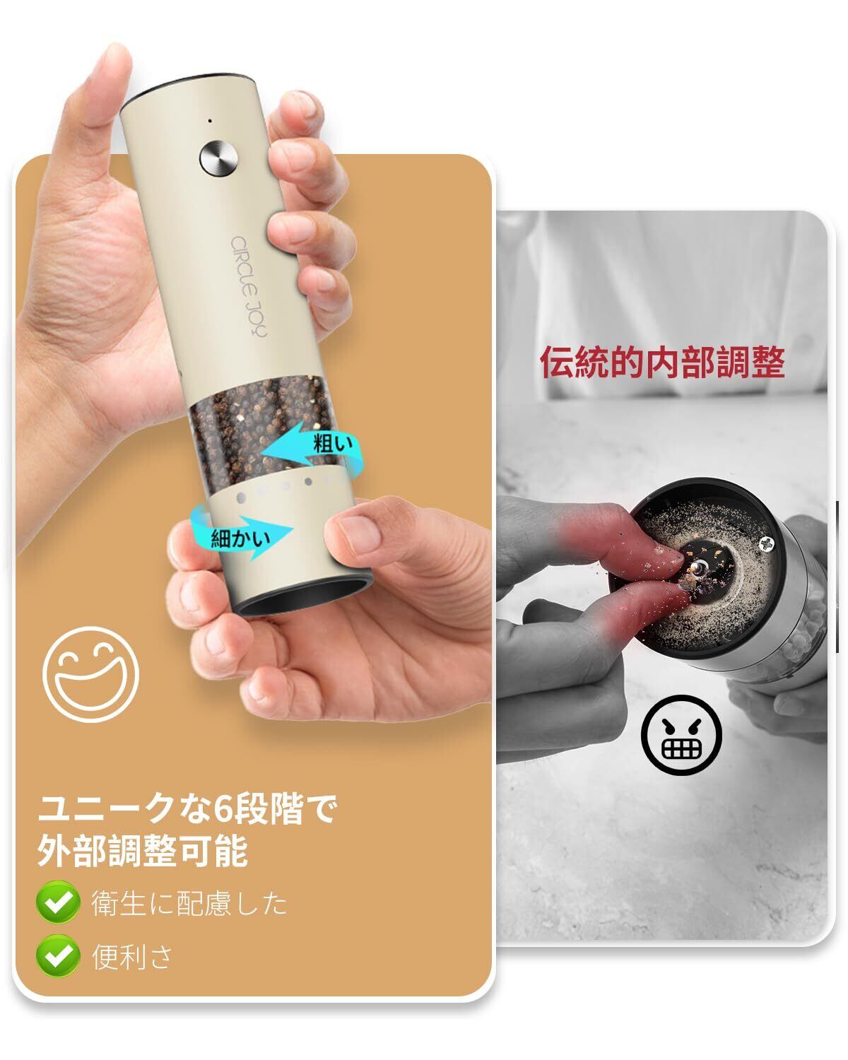 【数量限定】CIRCLE JOY 小型 充電式ペッパーミル 電動 ステンレス製ペッパーミル 厚さを外部で調整する 30ml容器 木製収納ベース ミニサイズ ベージュ