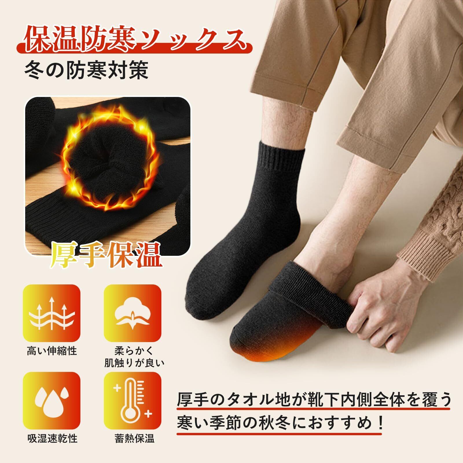 【クッション性 足を保護】:上質な柔らかい素材を採用して、裏側タオル地のようなパイル編みにより、クッションのように衝撃を吸収し、履き心地抜群な厚手靴下です。メンズ靴下の密度は高く、摩擦を効果に軽減、足の痛みをさけでき、360度から保護します。弾性材料によって伸縮性も高く、足が小さい方も大きい方も自由に履けます。