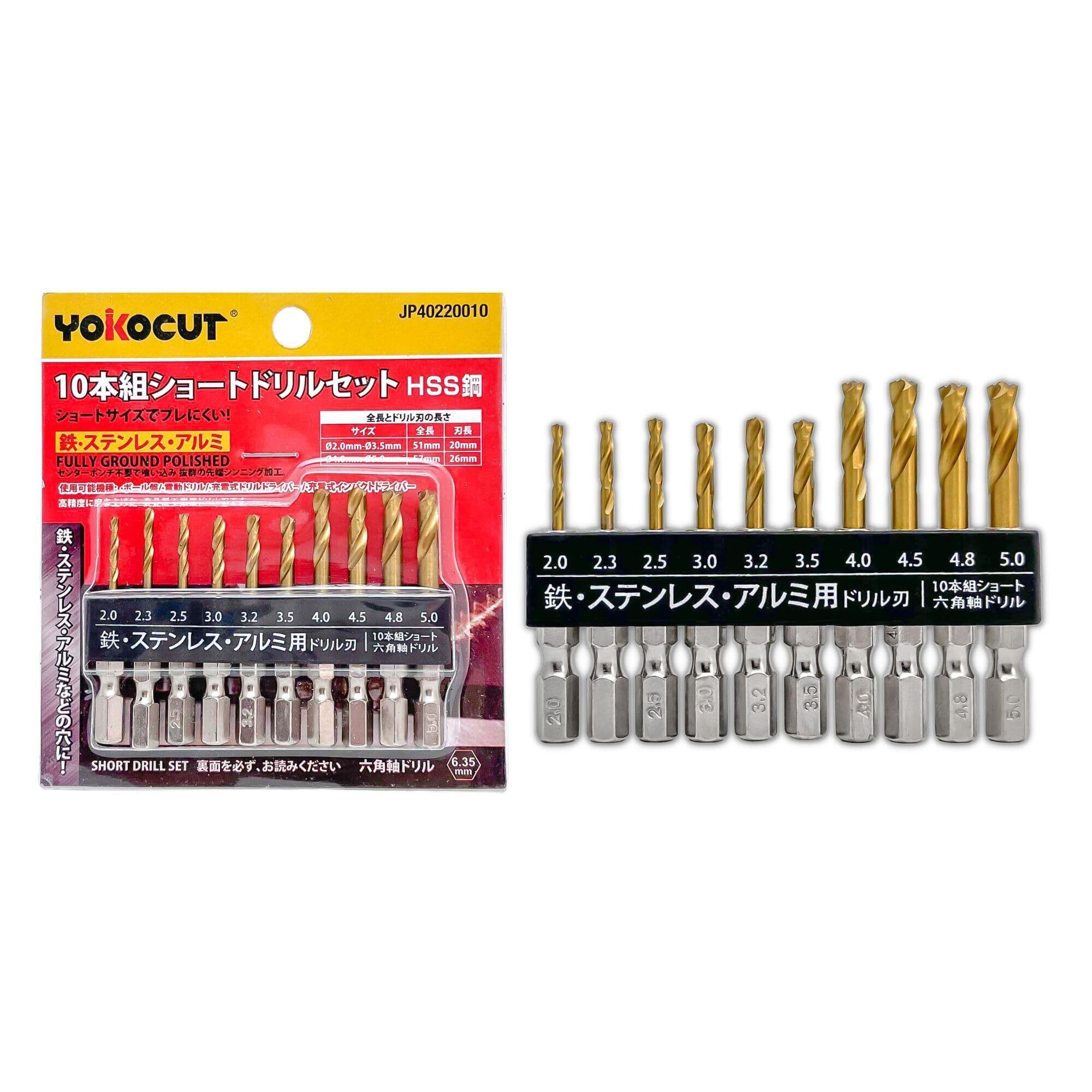 【商品名と特徴】YOKOCUT 鉄工ドリル 10本組 六角軸ショートドリルセット 鉄工用 チタンコーティング ドリルセット (金属・金工・木工)です。日式6.35mm六角柄を採用しており、インパクトドライバーなどのチャックに直接セットできます。充電式インパクトドライバー・ドリルドライバー・電気ドリなどの電動工具に対応しています。