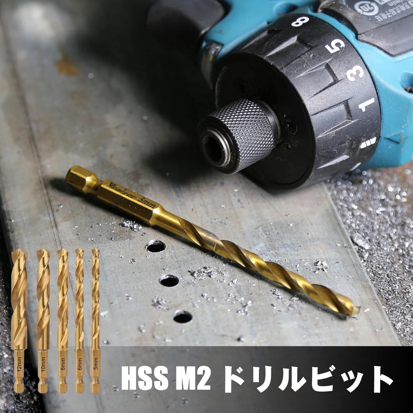 5本組鉄工用ドリル 刃ビットセット 5/6/8/10/12mm 六角軸 高速度鋼 M2 電動ドリルビット 掘削工具 穴あけツール ステンレス鋼 合金 金属 プラスチック 木工用