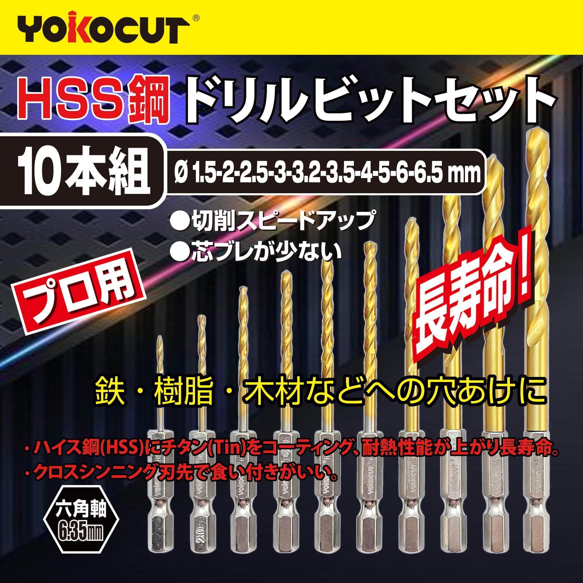 【商品名と特徴】YOKOCUT ドリルビットセット 10本組 六角軸ドリルビット 10本 セット DIY 電動工具 穴あけ 金属 木材 プラスチック 穴開けです。日式6.35mm六角柄を採用しており、インパクトドライバーなどのチャックに直接セットできます。充電式インパクトドライバー、ドリルドライバー、電気ドリなどの電動工具に対応しています。