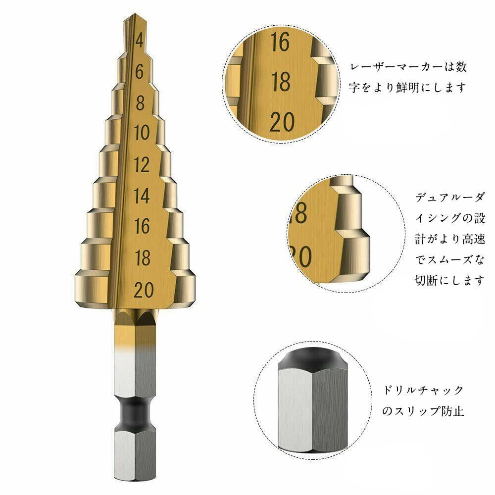 【材質】:本体はHSS鋼4241で、表面はチタンコーティングの処理され、普通の鋼製のステップドリルより硬度が高く、切れ味も抜群です。