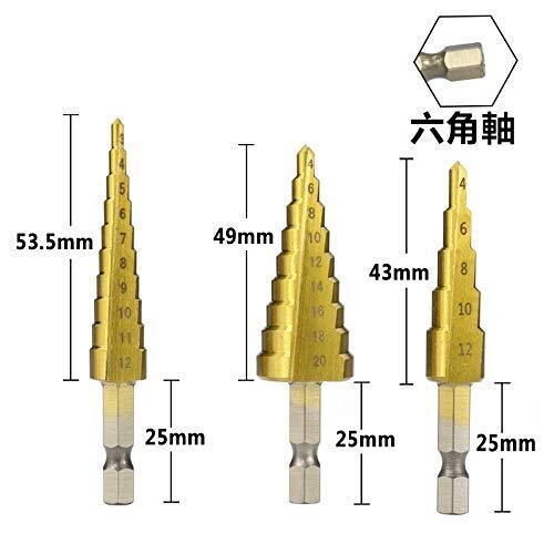 【新春セール】ステップドリル 2/3本セット 4-22mm 3-13mm/4-20mm 4-12mm 3-12mm チタンコーティング スパイラル HSS鋼4241板金用六角チタンコーンドリルビットホールカッター 六角轴スパイラル (3本セット4-20mm 4-12mm 3-12mm)
