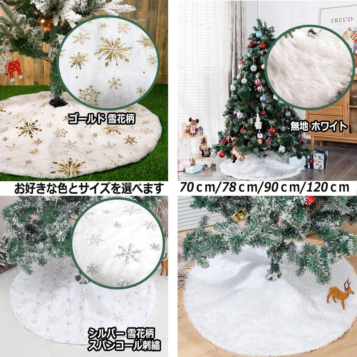 【素材&サイズ】クリスマスツリー スカートはポリエステル100%の起毛素材を使用しており、柔らかく快適な質感と申し分のない工芸品。サイズは直径78cmなので、180cm前後のツリーに合います。サイズは直径90cmなので、180cm以上のツリーに合います。