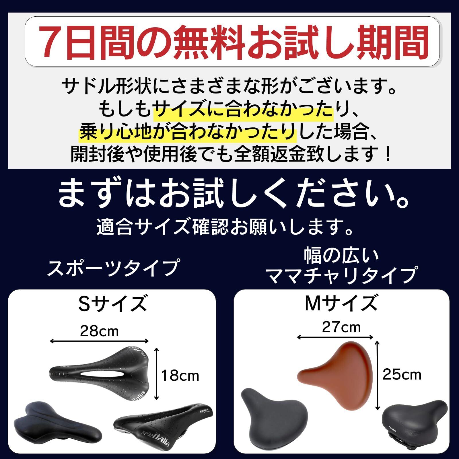 【ぴったり選べる2サイズ展開】 スポーツバイクにも、ママチャリにも。エアざぶはSサイズ(28×18cm)とMサイズ(27×25cm)の2サイズをご用意。お使いのサドルサイズに合わせて、無理なくぴったりフィット。工具なしで取り付けできるので、届いたその日からすぐに使えます。
