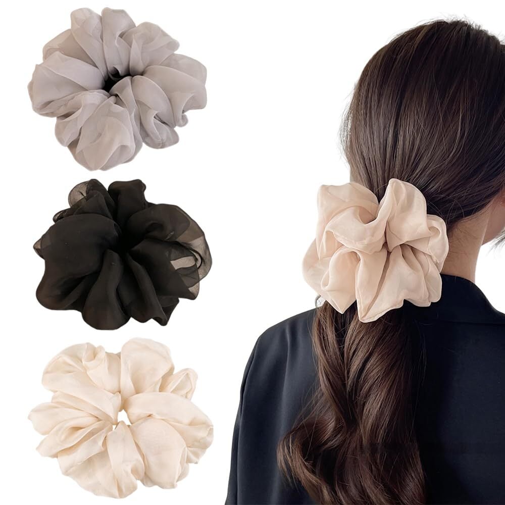 サムコス シュシュ 大きめ ヘアゴム 3色セット おしゃれな髪飾り 高弾力 絹布生地 ツルツルな触り心地 結びやすい 大人 レディース (黒+白+灰)
