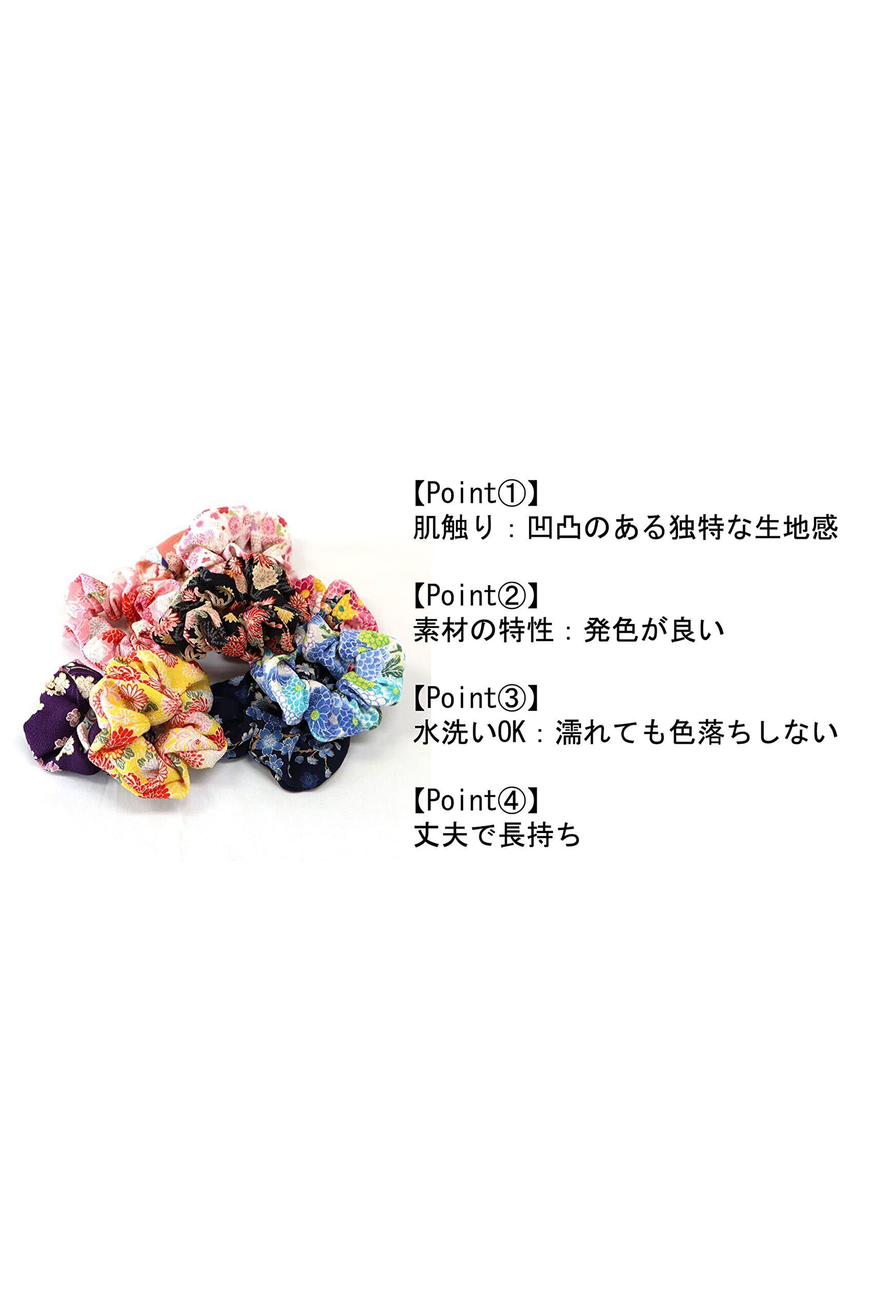 ◆【様々なシーンに】ポニーテールやお団子ヘアの仕上げ、チャームのようにバッグにつけたり、手首に巻いてブレスレット替わりに使ったり用途いろいろ。色鮮やかな和柄のシュシュを使ってテンションをあげたり、おうちでのリラックス時に愛用して下さい。