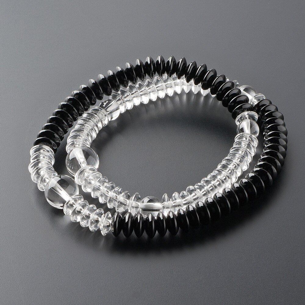 透明な美しい輝きを演出する本水晶と、漆黒に輝く光沢感が美しい黒オニキスを使用し、本式数珠と同じ仕様の主珠108個で仕立てた腕輪念珠(ブレスレット)です。寺院(僧侶)様用の正式な数珠一つである半装束念珠風にお仕立てさせていただきました。