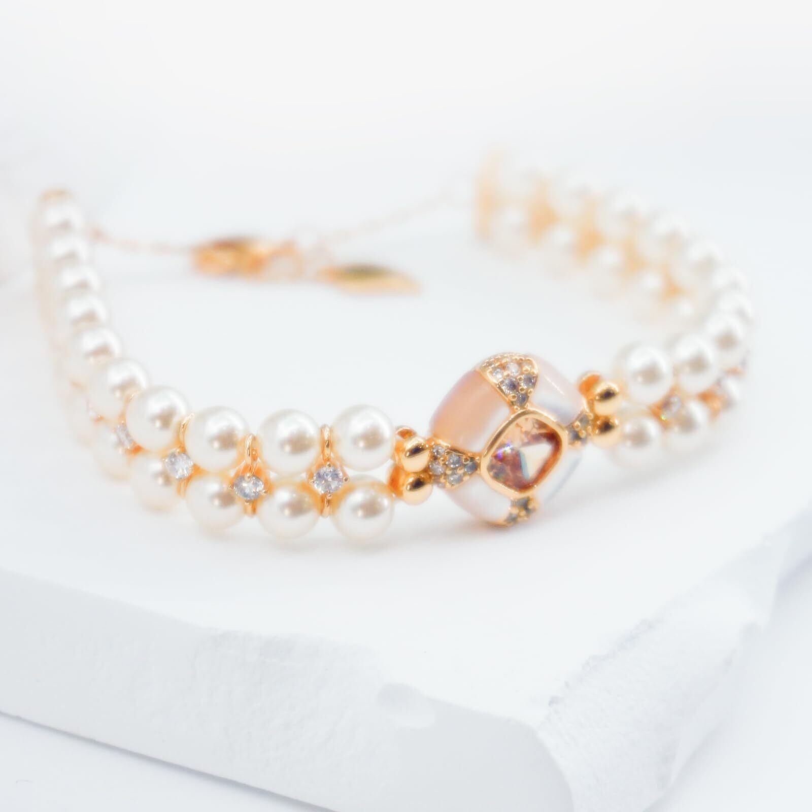 【二連パールと煌めくジルコニアの輝き】 このブレスレット レディース用アイテムは、繊細な二連の淡水パール ブレスレットチェーンが優雅な輝きを放ちます。双排のパールには、小さなジルコニアがさりげなく点在しており、エレガントでフェミニンな雰囲気を醸し出します。シンプルでありながら華やかで、普段使いからフォーマルなシーンまで幅広く活躍するブレスレットです。