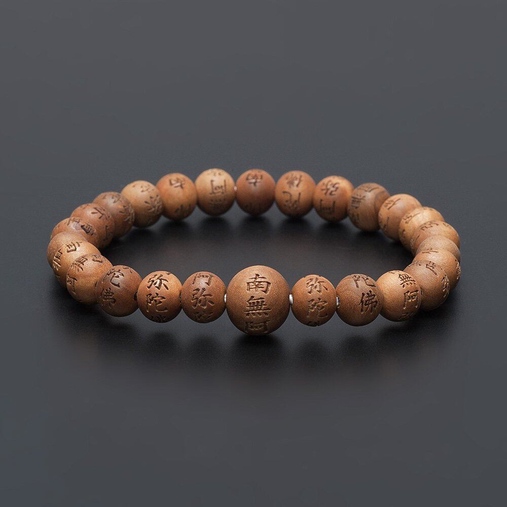 「南無阿弥陀仏」は浄土宗、浄土真宗などの大切なお念仏で、心のよりどころとされています。上質なインド白檀に、「南無阿弥陀仏」を細かく丁寧に彫り込んだ、功徳を常に身近に感じていただける念珠ブレスです。