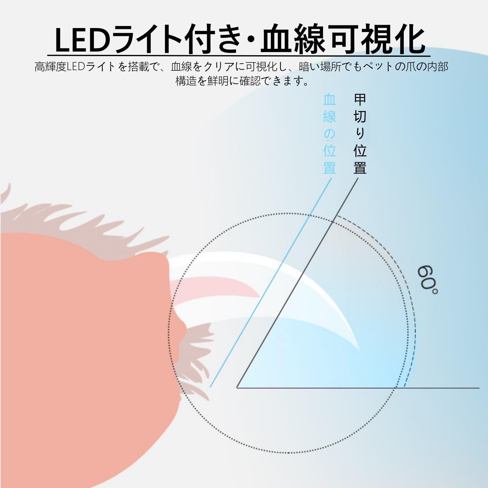 【日本上陸!高輝度LED×高品質ステンレス刃】日本ペットの爪に合わせた「匠のカーブ刃」高級ステンレスを職人が丁寧に仕上げ、切れ味長持ち。丸みを帯びた刃先は、愛猫・愛犬の爪の自然なカーブにぴったり沿い、スルッとした切り味で割れ・欠けを防ぎます。ワンちゃん、ネコちゃんの「血線」が一目で見える!内蔵の高輝度LEDライトが、爪の奥までクリアに照らし、血管(クイック)を見逃しません。暗いお部屋や夜のお手入れでも安心・安全。小動物にも優しい「深爪防止設計」うさぎ・ハムスターの繊細な爪にも対応。丸みを帯びた安全設計で、飼い主さまもペットもストレスフリー。