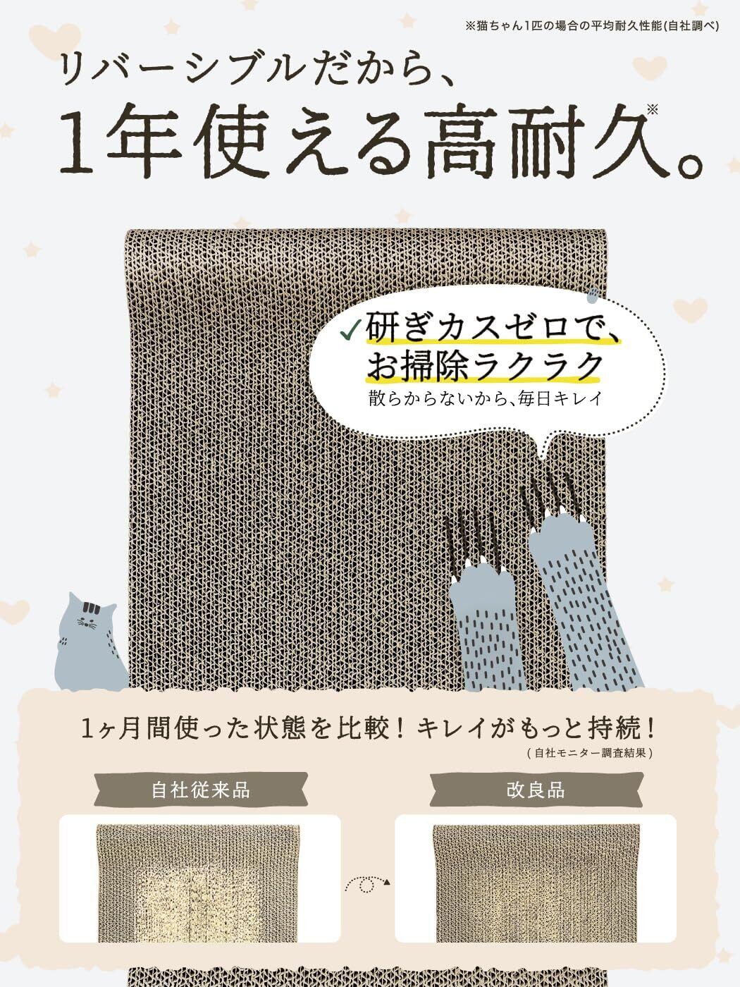【 研ぎクズゼロ 1年使える高耐久 大きな猫も快適 】一般的なダンボール製品よりもカスが出にくいよう工夫されています。裏表で約ご使用いただけます。※猫ちゃん1匹でご使用いただく場合【2024年12月リニューアル】より長く使っていただけるように段ボールの硬さを改良済み
