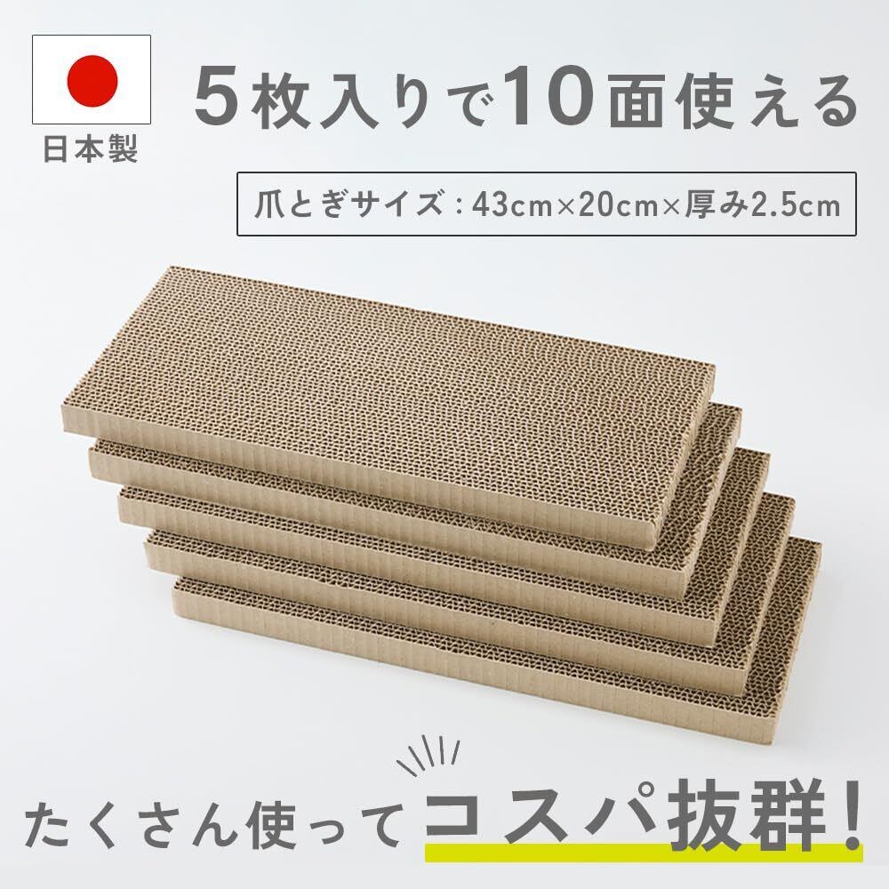 本体サイズ:44.5cm✕21cm✕高さ14cm 爪とぎサイズ :43cm✕20cm✕厚み2.5cm 5枚入りで10面使える。たくさん使えてコスパ抜群。