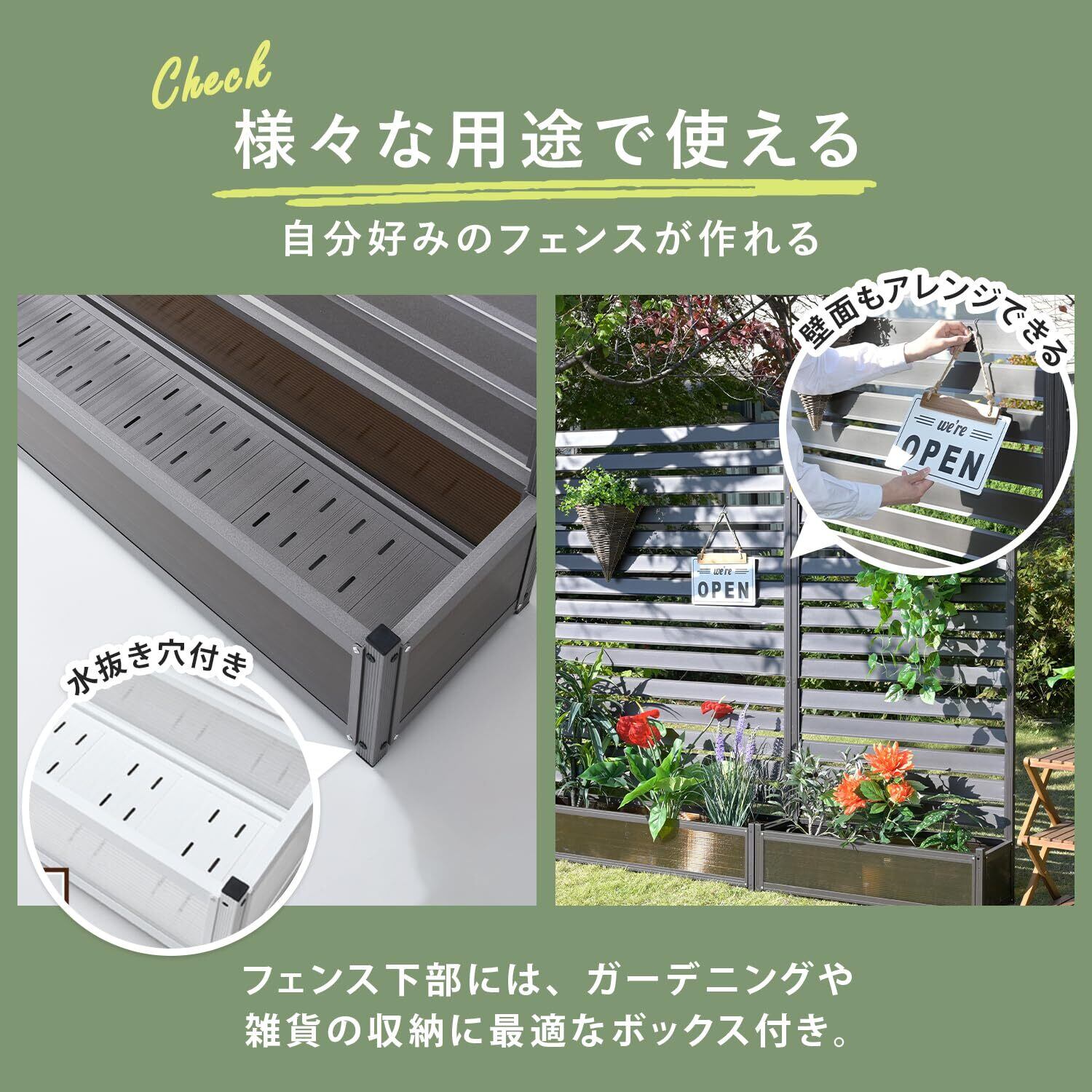 【様々な用途で使える】フェンスの下部には、ガーデニングや雑貨の収納に最適なボックス付き。