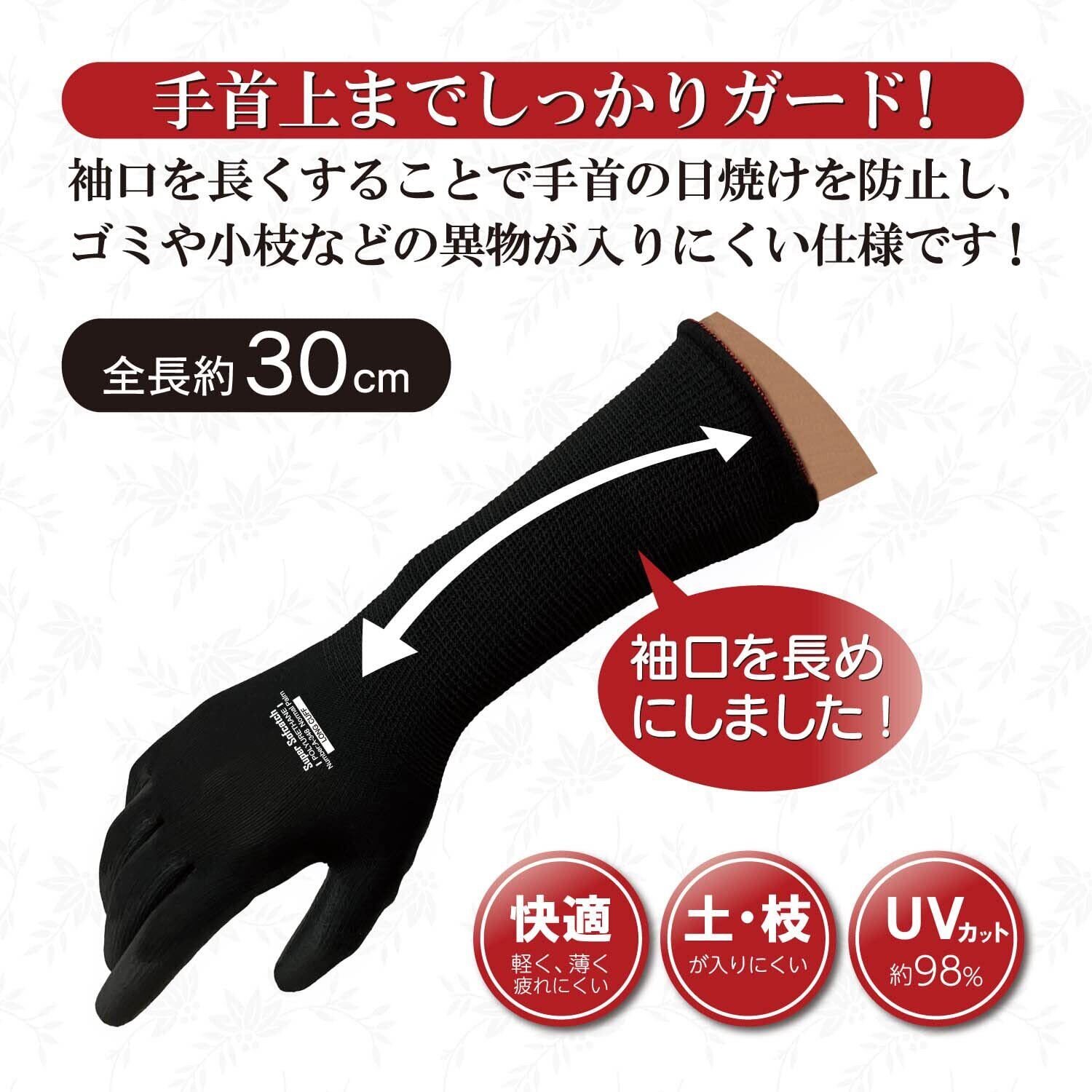 ●手首上までしっかりガード。●袖口を長くすることで手首の日焼けを防止し、ゴミや小枝などの異物が入りにくい仕様です。