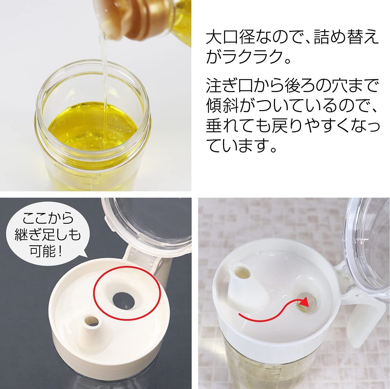 ◆液体調味料やオイルの保存にぴったり! ◆ワンタッチでオープン ◆500mlまでのメモリ付き ◆ガラスのような透明感で、割れにくく軽くて丈夫。 ◆キャップ付なので清潔です。 ◆使って安心日本製。 ◆垂れても戻りやすく傾斜がついています。 ◆変形および、ひび割れの原因となりますので、食器洗い乾燥機のご使用はお避け下さい。