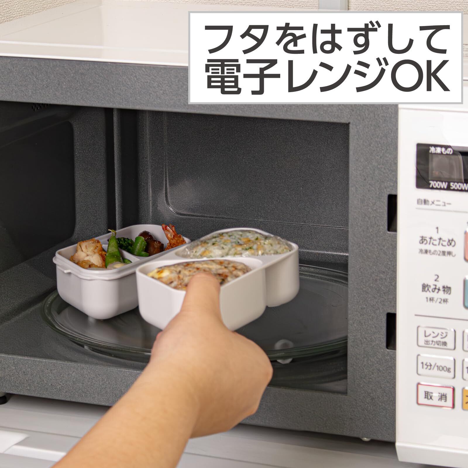 にぎらず作れて、おかずも入るおにぎりケース。簡単・時短おにぎりランチ本体(上)でコンビニおにぎりの1個分の大きさのおにぎりが2個作れます 本体(下)は仕切一体型でおかずが片寄りにくく、シールフタで汁漏れしにくい 抗菌剤添加。銀イオンの抗菌力が樹脂表面の細菌の増殖を抑制します。 トウモロコシ由来のバイオマス原料を約10%使用しており、CO2排出量の削減に貢献しています。 素材:本体(上・下)・フタ(上)・押シ型:PP フタ(下):PE 原産国:日本 サイズ:162×87×H91mm 容量:610ml(上段=165ml×2、下段=140ml×2)