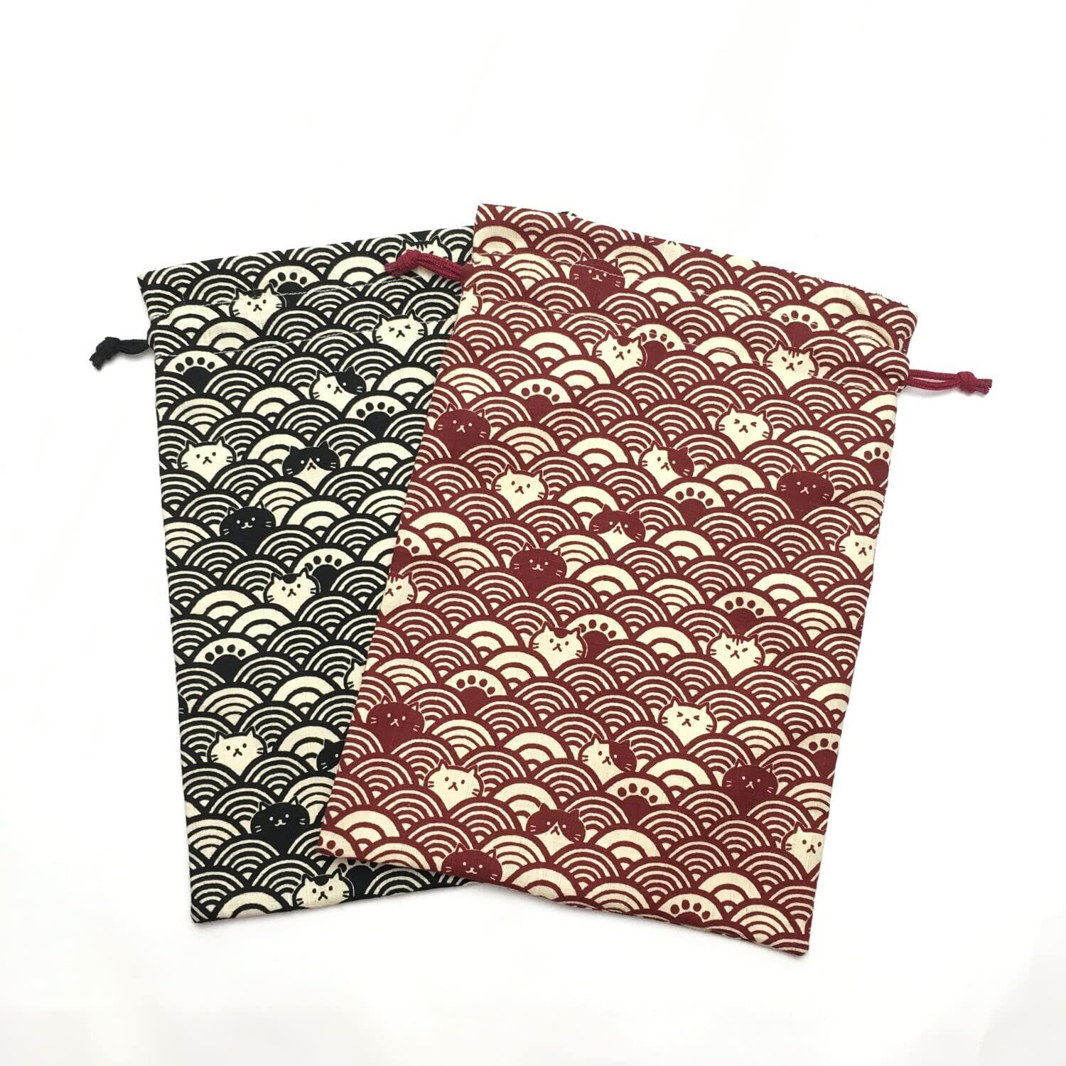 【数量限定】巾着 御朱印帳入れ 日本製 小物入れ 裏地付 猫柄 和雑貨 和柄 巾着袋 ki-155 (02 青海波ネコ 黒)