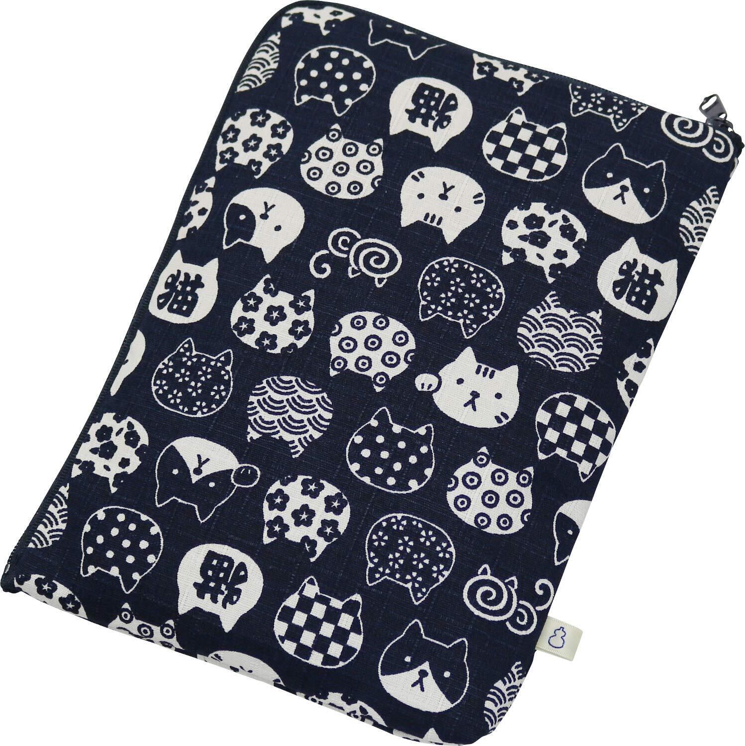京佑 日本製 綿 ポーチ コスメ メイク 約21×15cm 猫 ねこ L字ファスナー 化粧 旅行 ご朱印帳入れ にゃんこもん 紺 和柄