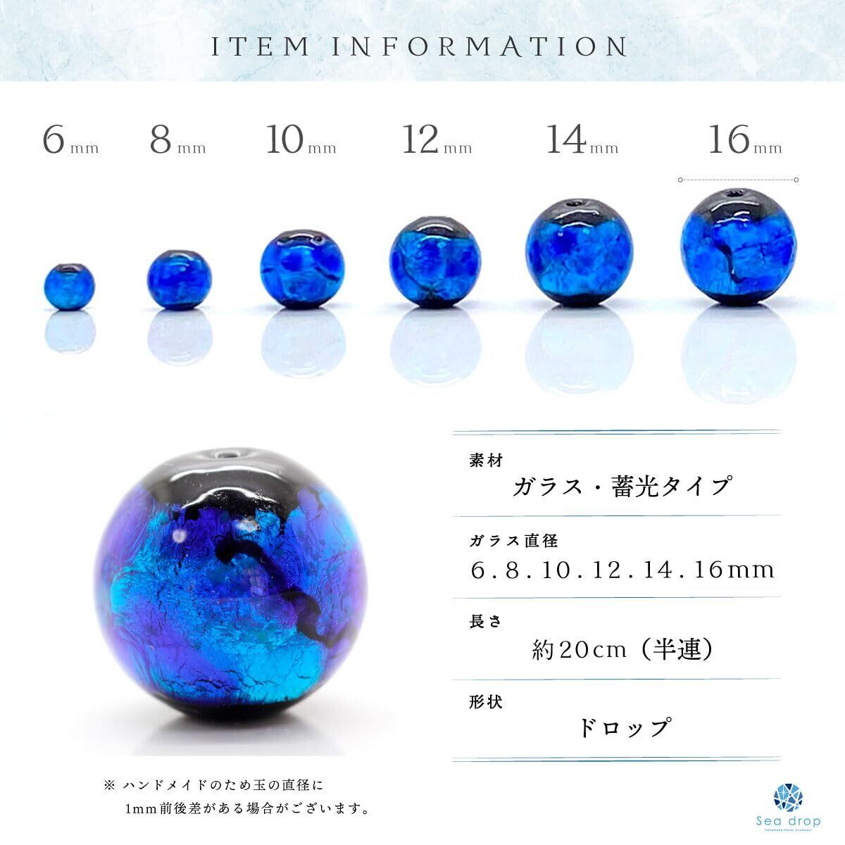 【2022最新】Sea drop 光る ホタルガラス ブルー 6mm 半連 35玉 約20cmビーズ 蓄光 青色 とんぼ玉 [020htt-06]