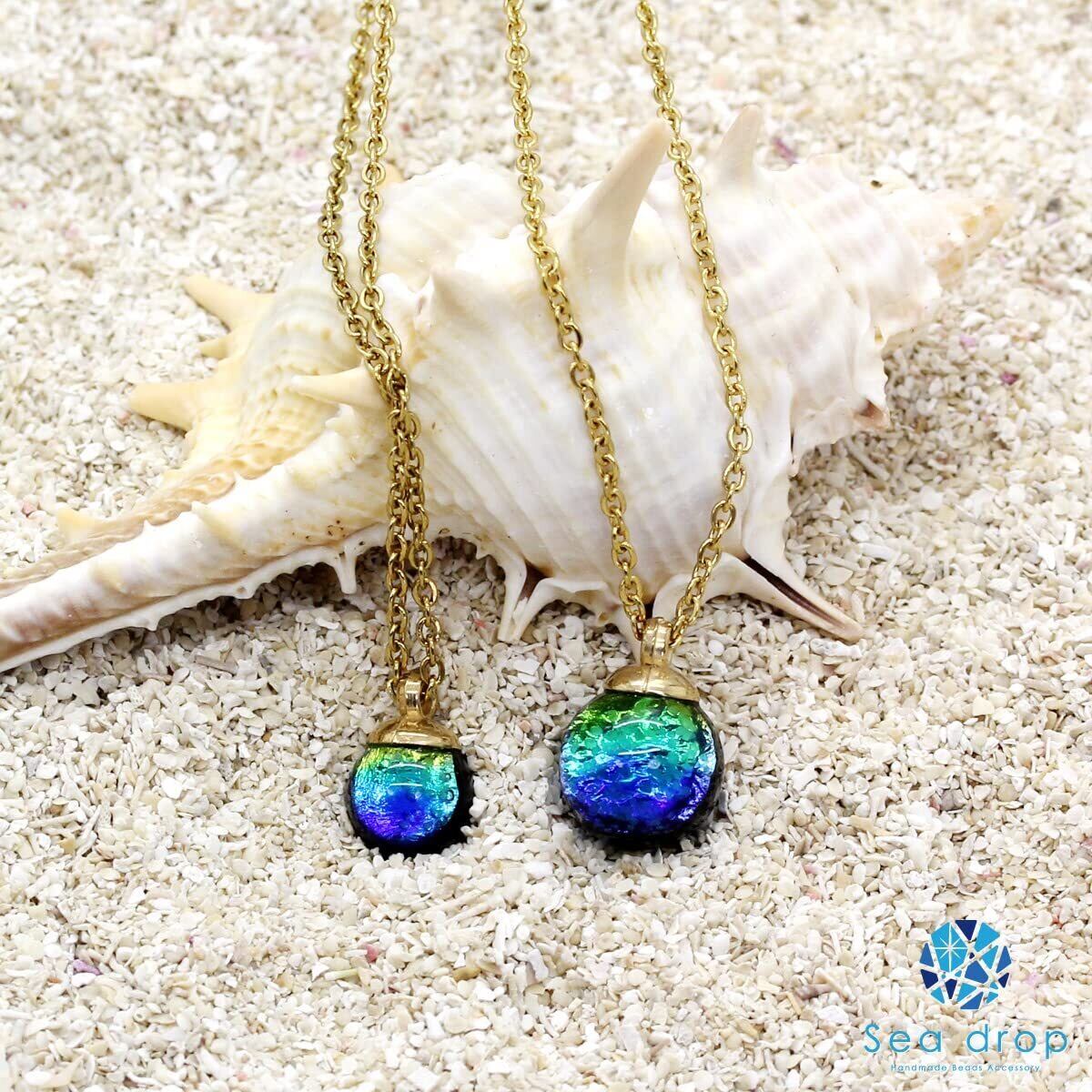 【人気商品】[Sea drop] 光る ホタルガラス ケラママリン 8mm ネックレス 蓄光 ステンレススチール抗アレルギー ゴールドチェーン とんぼ玉 [142nt-g]