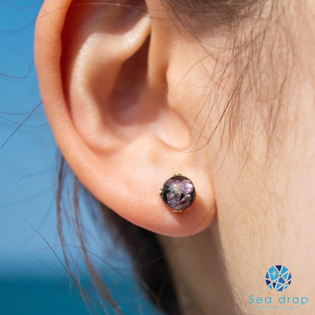 Sea drop 光る ホタルガラス スタッドピアス パープル 6mm 蓄光 レディース ステンレス金属 両耳用 ゴールド シルバー [309et]