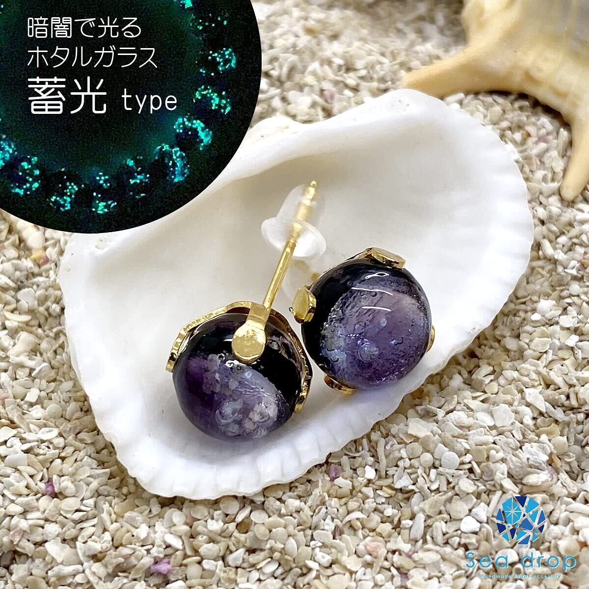 【新着商品】Sea drop 光る ホタルガラス スタッドピアス パープルマリン 蓄光 レディース ステンレス 金属アレルギー対応 両耳用 ゴールドカラー [089et-g]