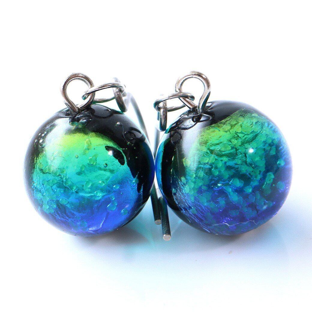 [GOLD STONE] 光る ケラママリン ホタルガラス ピアス 両耳用 フックピアス チタン製 とんぼ玉 沖縄 ラウンド