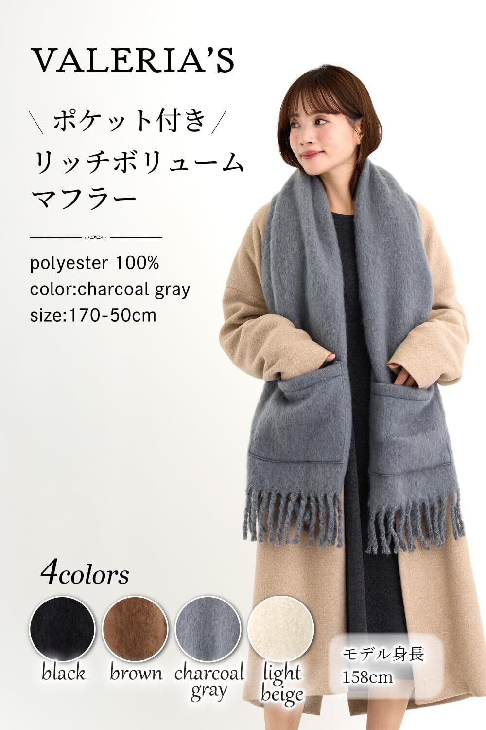 [valeria] バレリア 【超大判】 ポケット付き厚手マフラー レディース 防寒 冬 大きめ 無地 ふわふわボリューム ユニセックス