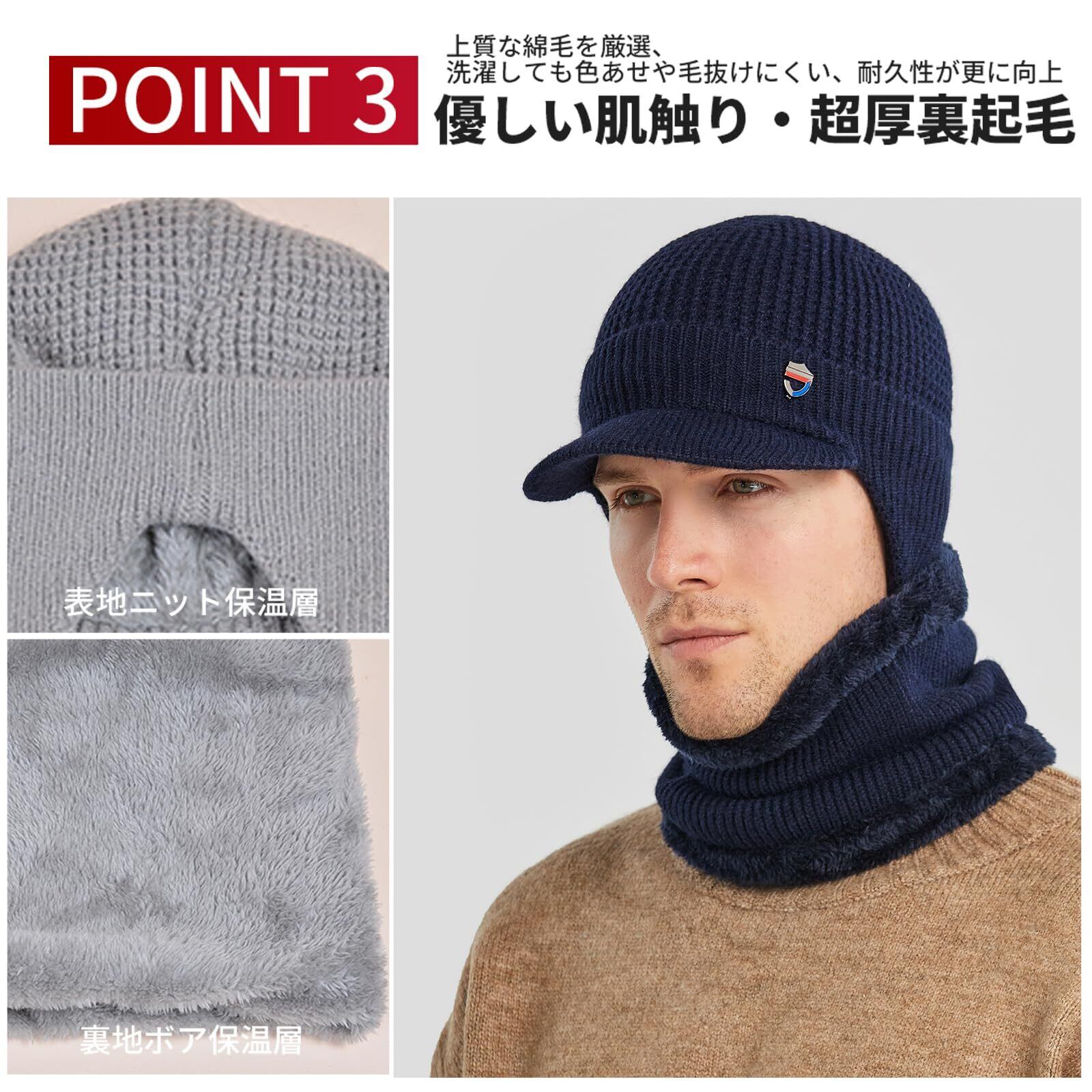 【保温強化】モコモコのボア生地が頭と首をすっぽり包み込んで、空気の流出がにくくなりますので保温力が高まります。また、外部のニット生地が精密に編み込まれており、冷たい空気を遮断しつつ温い空気をしっかり閉じ込めて、保温力が二倍にします!