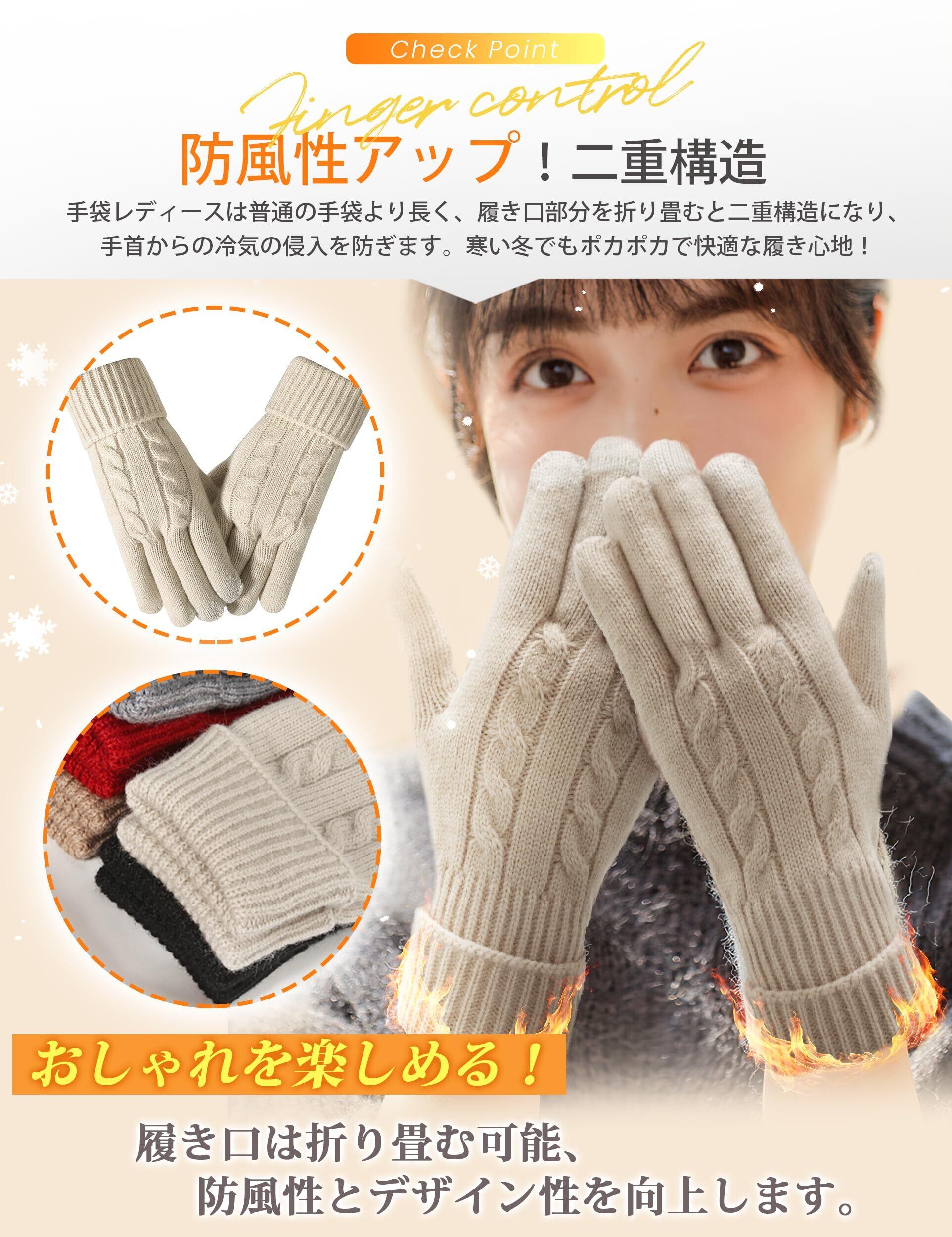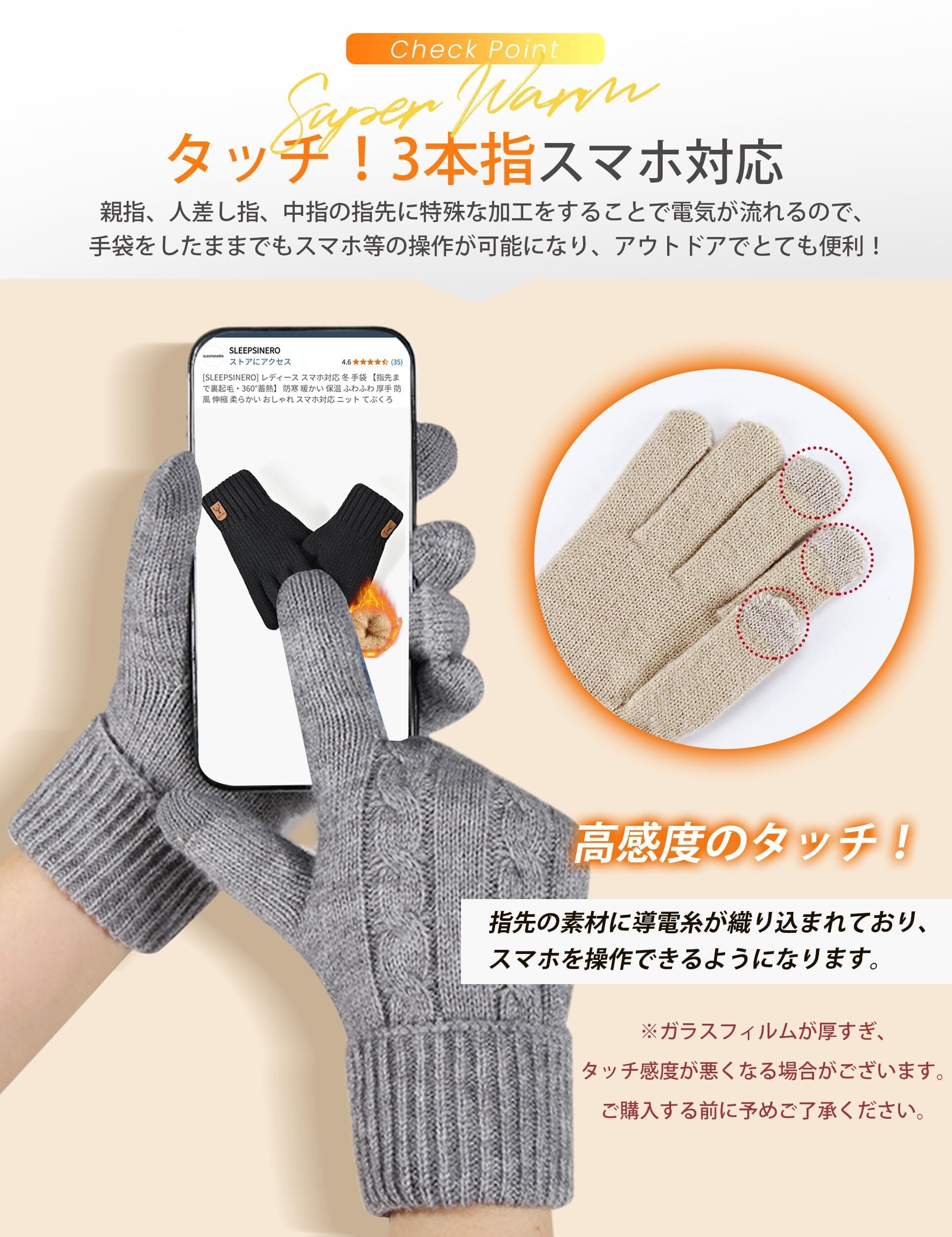 [SLEEPSINERO] 手袋 防寒 レディース スマホ対応 【360°暖かい裏起毛!3本指タッチパネル】 保温 あったか 防風 伸縮 柔らかい おしゃれ ニット レディース手袋 てぶくろ 秋 冬 通勤 通学 女性